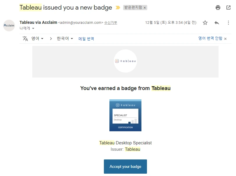 이런 맥락에서, 태블로의 기본적인 기능과 제품에 대한 이해를 알고 있다고 증명하는 태블로 자격증은 나에게 상당히 괜찮은 선택지로 느껴졌다. 자연스럽게 3번과도 연결되는데, 태블로 데스크탑 스페셜 라이선스는 자격 유효기간이 존재하지 않는다. 한번 따 놓으면 추가 비용을 들여 갱신을 할 필요가 없었던 것이다. 게다가 시험을 보고 나서 바로 결과를 확인할 수 있고, 합격 배지도 2시간 내에 바로 메일로 발송해준다. 해당 배지는 링크드인을 비롯한 각종 SNS에 바로 연동시켜 업로드도 할 수 있다.