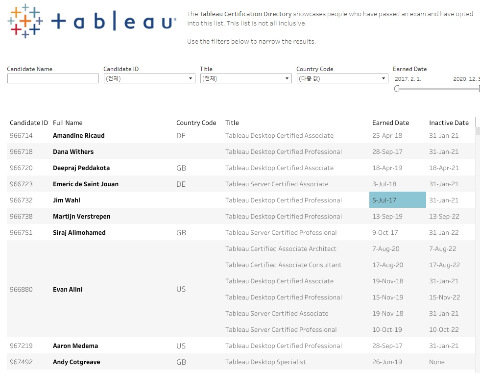 추가로 마지막 4번은 꽤나 많은 사람들이 인지하지 못하고 넘어가는 부분인데, 태블로 웹사이트에서 태블로 관련 자격증을 가지고 있는 사람들을 모두 조회할 수 있다. 최종 업데이트일이 12월 3일인데, 난 그 이후 합격해서 그런지 아직 대시보드에서 조회는 안 되는.. 합격 후 이를 공개/비공개할 것인지도 직접 설정할 수 있다.