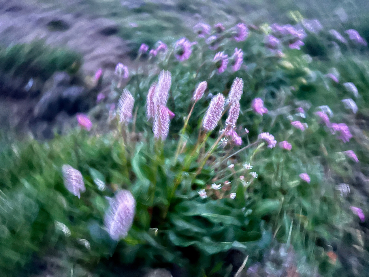 이곳 식생의 다양함도 끝이 없었다. 고산봄맞이, 산석송, 가솔송(열매), 콩버들, 두메투구꽃, 숙은꽃장포, 담자리꽃나무, 구름국화, 두메분취, 둥근바위솔, 산각시취, 바위구절초, 등대시호... 감탄의 연속이었다. 그 외에도 2500 고지와 겹치는 꽃들도 많았다. 두메양귀비, 구름범의귀, 돌꽃, 좁은잎돌꽃, 호범꼬리, 씨범꼬리, 구름송이풀, 두메자운 등, 서식 조건의 범위가 넓은 꽃들이라 볼 수 있겠다.
