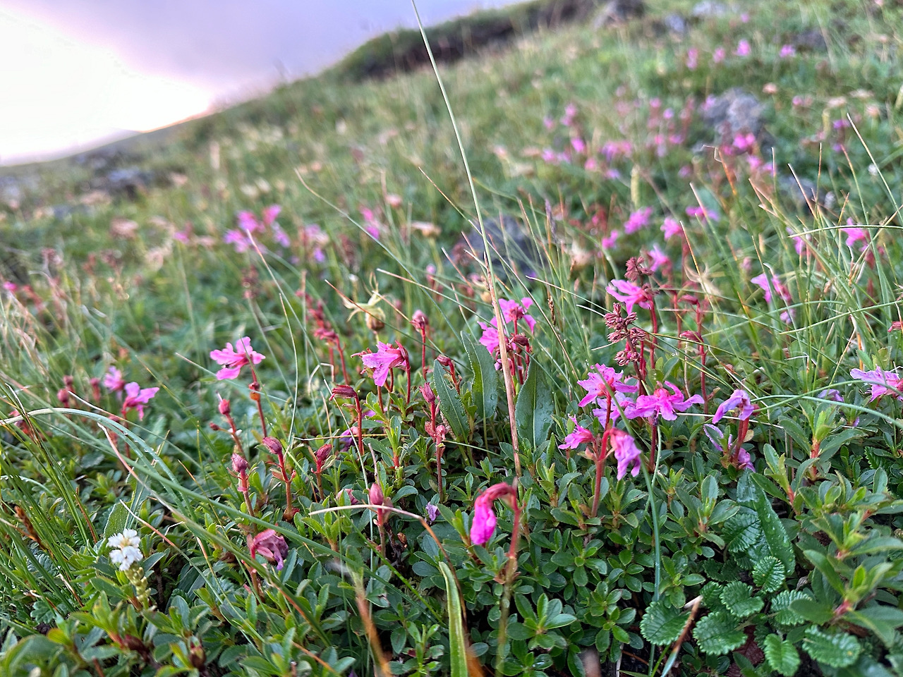 이곳 2300 고지에서는 햇볕이라는 조명을 충분히 활용해 식생들을 제대로 관찰할 수 있었다. 진한 보라색의 하늘매발톱이 먼저 눈에 띄었다. 식물원에서는 많이 보았지만 자생지에서는 처음인데, 그 묘한 파랑 색감이 우리의 눈을 자꾸 끌어당겼다. 또 내 눈을 사로잡은 건 좀참꽃이라는 진달래과 식물이었다. 진달래, 꼬리진달래, 철쭉, 산철쭉, 흰참꽃나무 등 한반도에는 진달래과 식물들이 참 다양하게 서식하고 있다. 좀참꽃은 처음 보았지만 전혀 좀스럽지 않았다. 그 분홍 색감에 매료되어 더 멋진 모델을 찾느라 언덕 위로 올라가다가 안내자의 제지를 받기도 했다.