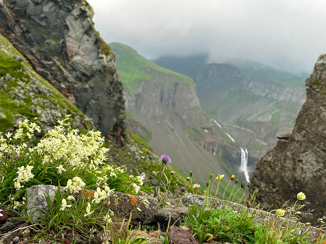 야생화를 따라 흑풍구를 위로 위로 오르다 보니 눈앞에 또 하나의 장엄한 광경이 펼쳐졌다. 장백폭포(비룡폭포)였다! 멋지게 쏟아지는 물줄기가 저 멀리 보이는데, 그 앞에 가는다리장구채와 두메분취와 두메양귀비가 멋진 자태를 취하고 있다.