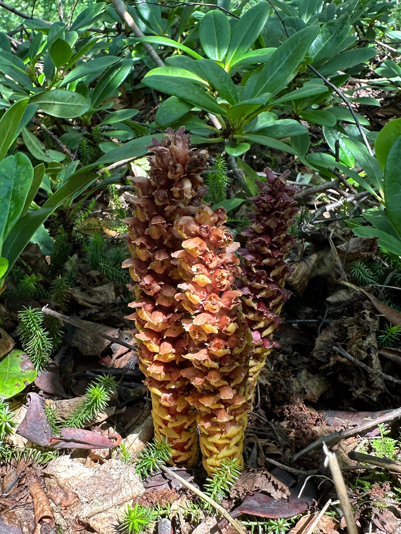 머릿속은 비로용담의 코발트색 파장에 여전히 점령된 상태로 5분여를 걸었을까? 미리 앞서 갔던 우리 팀의 야생화 리더가 저쪽에서 흥분된 모습으로 우리를 기다리고 있었다. 진시황의 불로초 중 하나를 찾아냈다는 것이다. 게다가, 자신의 야생화 탐사인생에서 본 것 중 가장 개체가 많고 온전한 모습이라는 것이다. 우리는 그게 뭘 말하는지 몰랐지만, 안내자의 지시에 따라 두세 명씩 조를 이뤄서 기다리다가 그 불로초를 알현하러 조심조심 거친 숲으로 들어갔다. 햐아~ 야생화 리더가 가리키는 곳을 보니 정말 신기한 식물체가 눈에 들어왔다. 밝은 갈색과 노란색이 켜켜이 어우러진 길쭉한 솔방울 모양의 식물이었다. 네 개의 개체가 같은 지점에 뿌리를 박고 건강한 모습으로 꼿꼿이 서 있었다. 주변에는 진초록의 만병초가 이 "불로초"를 에워싸고 있다. 정식이름은 오리나무더부살이라는 부생식물이었다. 이 식물이 불로초라는 믿음 때문에 사람들이 보는 대로 채취를 해가서 보기가 더욱 힘들어진다고 했다. 나는 이 식물체의 모습을 한동안 감상한 후에 정신없이 사진에 담았다. 그 색감과 모양을 최대한 잘 담으려고 애썼지만 차례를 기다리는 팀원들을 생각해 서둘러 자리를 벗어났다.