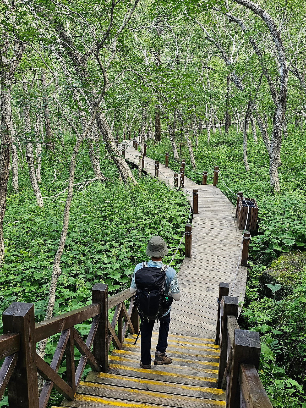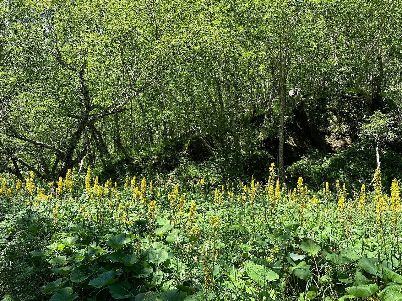 데크길을 따라 오르면서 꽃쟁이답게 우리는 주변의 야생화들에 계속 눈길을 주었다. 노란색 꽃들이 여기저기 도열해 있었다. 숙소 주변에서 이미 보았던 어리곤달비 군락과 처음 마주하는 진한 노랑빛의 금매화 무리들, 그리고 멀리 주상절리로 이루어진 산봉우리 앞에 울창한 숲을 이루고 있는 사스래나무 군락지, 그리고 흰색 꽃을 달고 꺽다리처럼 여기저기 서있는 박새 군락지도 보였다.