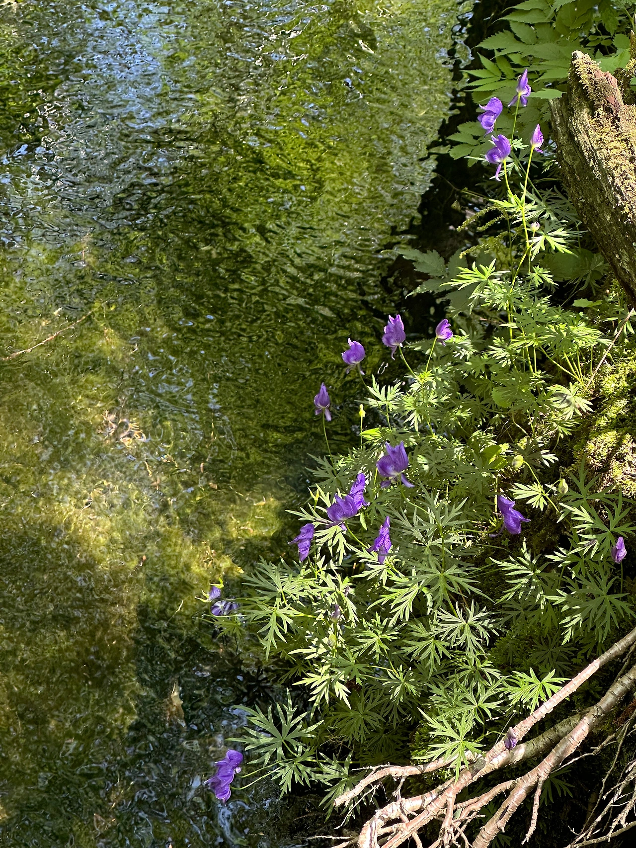 주차장으로 돌아온 우리는 곧바로 개울을 건너서 소천지로 이어지는 숲길을 따라 야생화탐사를 이어갔다. 개울 옆을 따라 이어지는 야생화탐방로는 데크길로 잘 조성되어 있었고 수많은 야생화가 여기저기서 우리를 기다리고 있었다. 가장 먼저 눈에 띈 야생화 군락은 어리곤달비였다. 실개천을 중심으로 형성된 습지에 그들은 밭을 이루고 있었다. 곧이어 각시투구꽃 군락이 맑은 실개천 가장자리에 깔끔하고 화사한 모습으로 멋진 반영을 드리우며 우리를 반겼다. 한국에서는 만나보지 못했던 투구꽃 종류로, 잎이 잘게 갈라지고 꽃은 밝은 보라색을 띠고 있어서 이름에 '각시'라는 접두어가 붙은 이유가 쉽게 납득이 갔다.