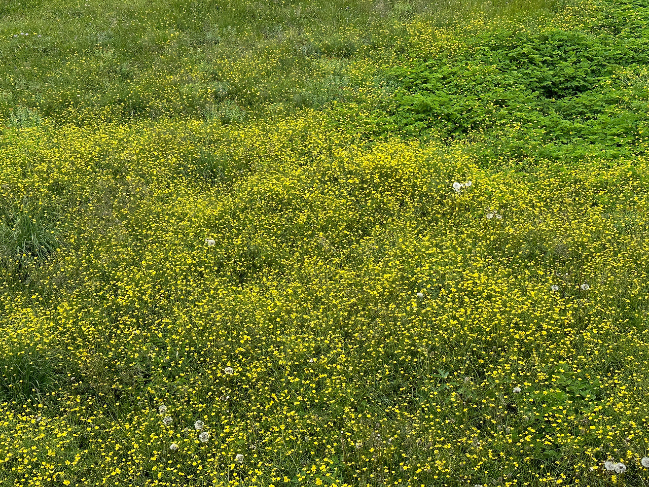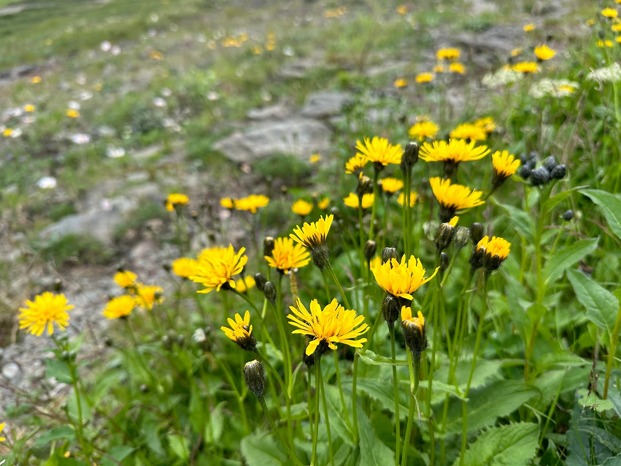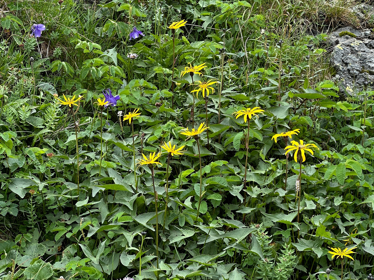 계단초입부터 우리의 눈길을 사로잡은 건 온통 노랑의 벌판이었다. 한 가지 꽃이 아니었다. 작고 앙증맞은 노랑꽃들의 군락이 먼저 눈에 들어왔다. 산미나리아재비라고 했다. 초록에 노랑꽃이 빽빽이 들어찬 모습이 밤하늘에 촘촘히 들어찬 별들 같았다. 강원도 고산에서 왜미나리아재비와 미나리아재비는 무수히 많이 보아왔지만 산미나리아재비는 처음이다. 두 번째로는 조밥나물을 닮았지만 꽃이 크고 색이 더욱 뚜렷한 껄껄이풀이라는 야생화 군락이었다. 나중에 확인해 보니 고려조밥나물이라는 이명도 지니고 있었다. 계단길에서 멀리 떨어진 경사면에는 크고 튼튼해 보이는 노랑꽃들이 엄청난 군락을 이루고 있었는데 화살곰취라고 했다. 가까이에도 몇 개체가 보여서 자세히 들여다보니 잎이 화살모양이었다. 처음 보는 꽃들이 왜 이리도 많은 지 감탄의 연속이었다. 사실, 그 감탄과 감흥을 즐기러 백두산 야생화 탐사에 나선 게 아닌가?