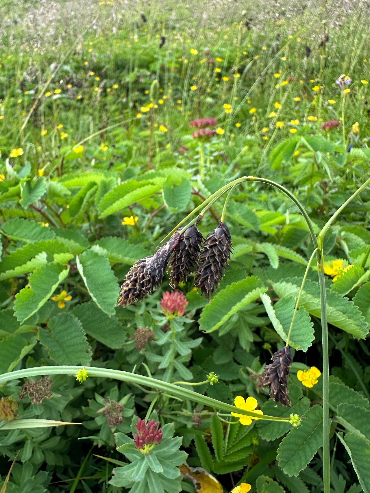사초 종류인데 줄기에 비해 열매가 무척 커서 검고 두툼한 이삭을 아래로 숙이고 있는 식물이 많이 눈에 띄었다. 나중에 알아보니 감둥사초라 했다. 검둥을 부드러이 표현한 느낌이 들었다. 검둥, 감둥, 감동, 이 세 단어가 왠지 내게는 비슷한 느낌이 들었다. 잎도 줄기도 꽃차례도 무척이나 튼튼해 보이는 큰오이풀이란 식물도 처음 만났다. 황송포 습지에서 만난 가는오이풀과는 전초의 모양이 아주 대조적이었다. 한국의 고산에서 많이 보이는 산오이풀이 화려함을 선사한다면 큰오이풀은 건강함의 표본 같아 보였다. 멀리 경사면에는 흰색 꽃을 달고 우뚝우뚝 서있는 박새 군락이 많이 보였다. 박새는 언제 어디서 봐도 크고 튼튼하고 수수하다. 저렇게 크고 높게 자라난 식물체가 가을과 겨울을 지나면서 자신을 철저히 녹여버려서 초봄엔 그 흔적도 찾아볼 수가 없다. 나는 박새의 이런 삶의 사이클에 늘 감동을 받는다. 제 때가 되면 그들은 또 싹을 틔워 일어나 거대한 군락을 이룰 것이다.