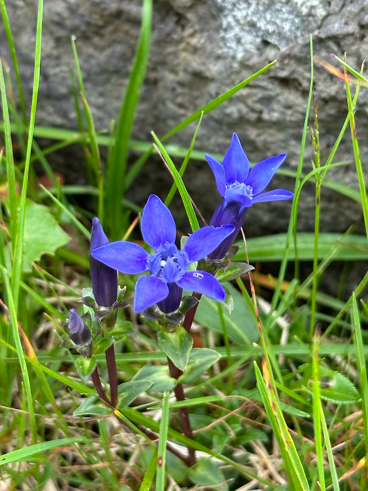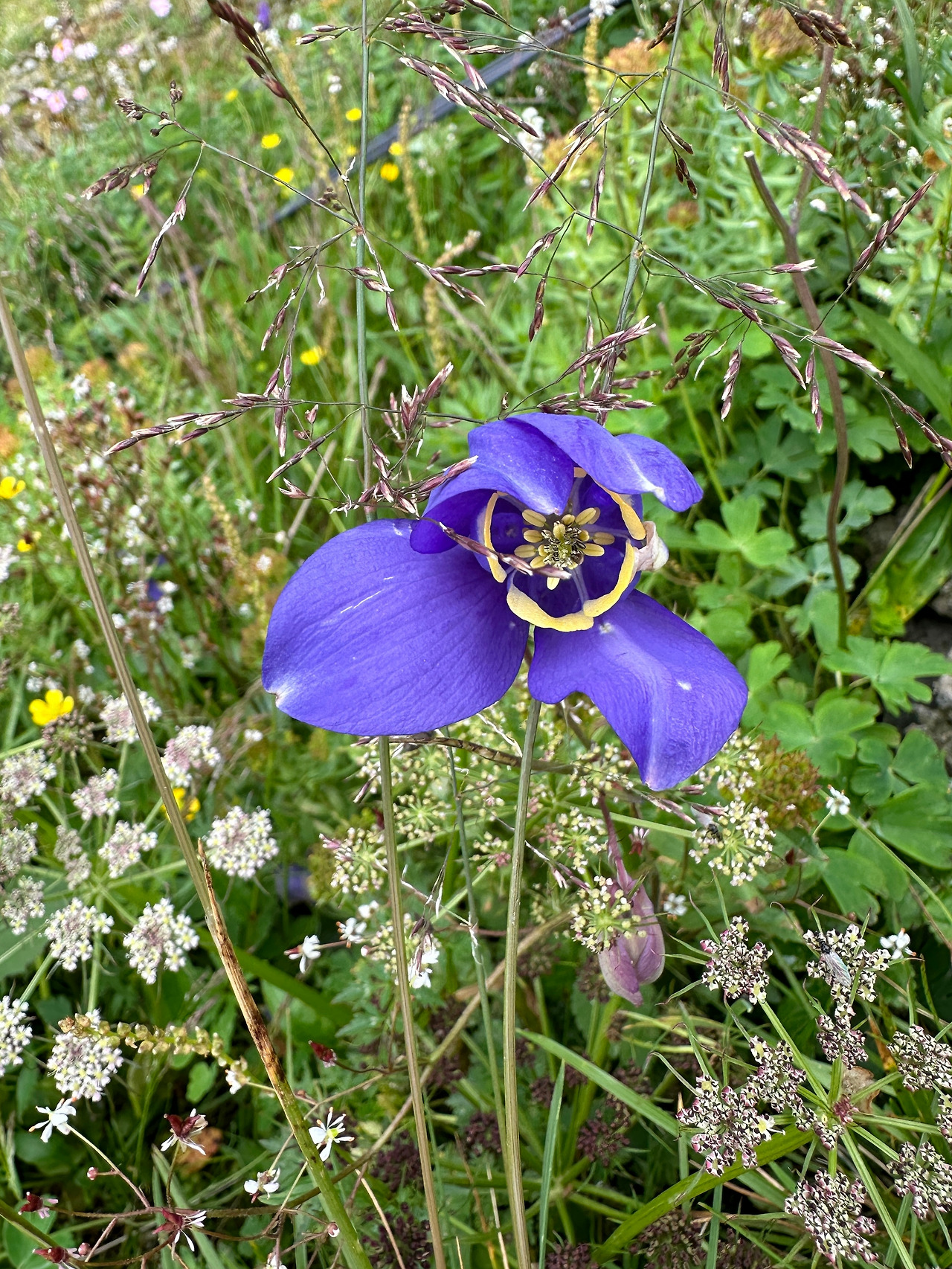 계단길 좌우에서 그 무엇 보다 우리의 눈길을 잡아끈 것은 비로용담이었다. 소천지 근처에서 처음 마주했던 그 감동은 다시 보아도 여전했다. 꽃잎도 꽃술도 오로지 코발트블루, 그 강렬한 색감은 아무리 반복해서 보아도 우리의 뇌파를 쥐고 흔드는 것 같았다. 한 마디로 자신감 뿜뿜이다. 꽃색은 비슷하지만 보다 부드러운 파란색을 지닌 하늘매발톱도 여기저기서 자신을 뽐낸다. 이곳의 하늘매발톱은 꽃술 주변에 노란 테두리를 더하여 보다 세련된 느낌을 준다.