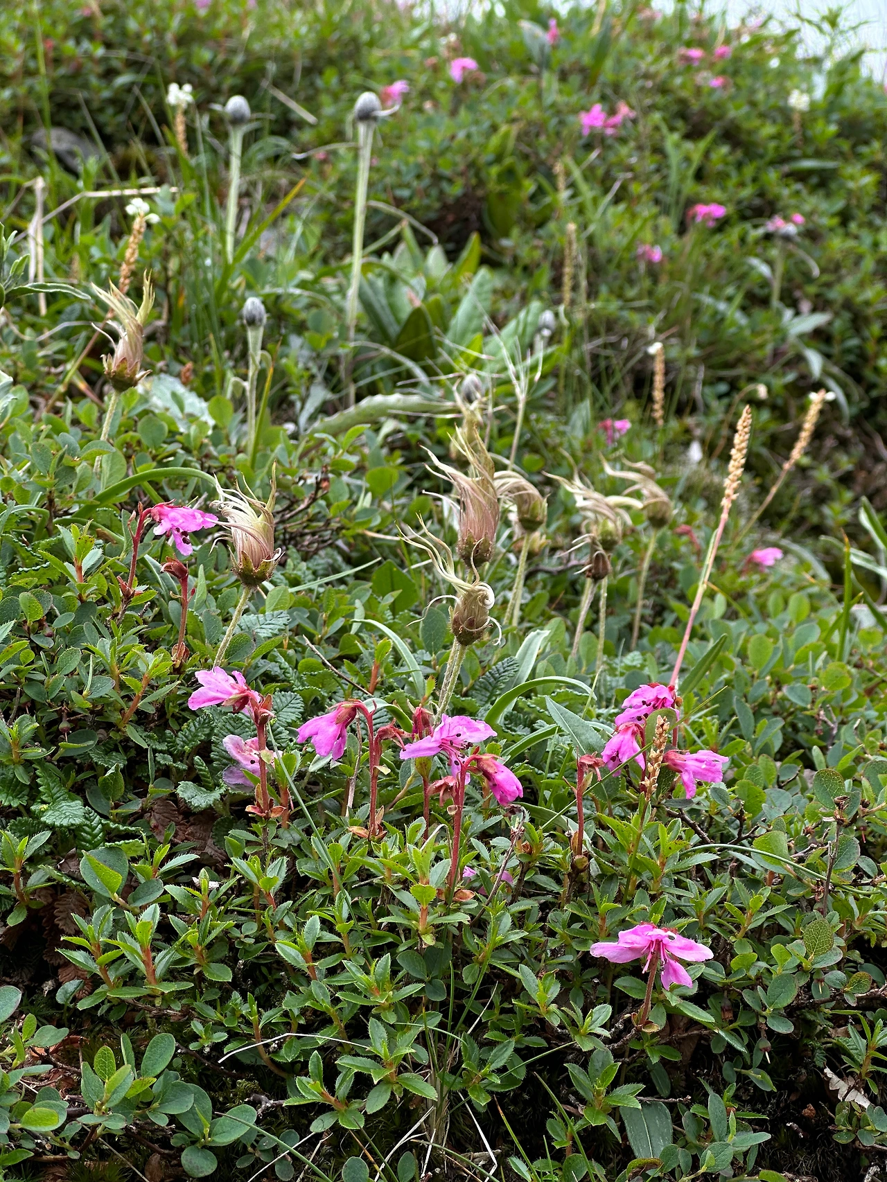 처음 마주하는 꽃들에 정신이 팔려 있는데 아주 익숙한 꽃이 눈앞에 나타났다. 가을이 되면 야생화 애호가들의 사랑을 독차지하다시피 하는 물매화다! 한국에서는 9월이나 되어야 모습을 드러내는 물매화가 백두산 고지에서는 7월에 개화를 하다니… 그 청초한 아름다움은 어디에서든 다를 바가 없다. 물매화에서 벗어나 고개를 드니 계단 옆 언덕에 익숙한 분홍 꽃들이 즐비하게 피어 있다. 좀참꽃이다. 천문봉에서 처음 만났을 때 나를 언덕 위로 계속 잡아끌었던 바로 그 진달래과 식물이다. 꽃색이 옅지도 진하지도 않아서 분홍색의 표본처럼 느껴지는 이 꽃은 이곳에서 처음 만난 것처럼 여전히 내 마음을 사로잡았다. 분홍색에 정신이 팔려 좀참꽃 뒤에서 멋진 배경을 선사하고 있는 담자리꽃나무를 놓칠 뻔했다. 꽃은 이미 절정기를 지나 제 모양을 잃었지만 서로 감싸 안고 씨방을 보호하고 있는 꽃잎의 모습은 장엄하게 아름다웠다.