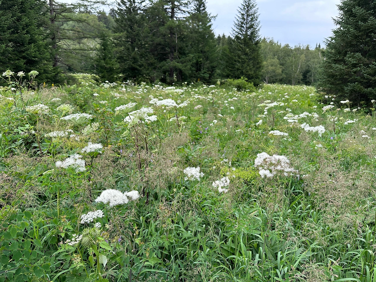 나무 그늘을 벗어나 데크길을 몇 발자국 걸어 나가니 시야가 확 트인 초원이 나타났고 온갖 흰 꽃들이 먼저 눈에 들어왔다. 설악의 마등령 삼거리에서 군락으로 보았던 꿩의다리를 비롯해, 강원도 고산에서 많이 자생하는 산형과 식물들이었다. 개구릿대와 좁은잎어수리라는 이름의 흰색 천으로 초원이 온통 뒤덮인 듯했다. 왜우산풀도 간혹 눈에 띄었다. 늦여름 소백산 능선을 걸으며 만끽했던 냉초 군락도 나타났고 소천지 숲길에서 이미 만난 민박쥐나물도 참 많이 보였다.