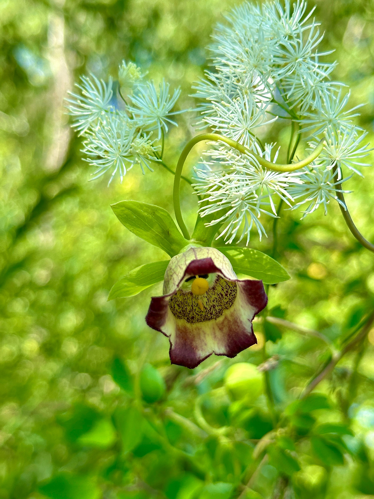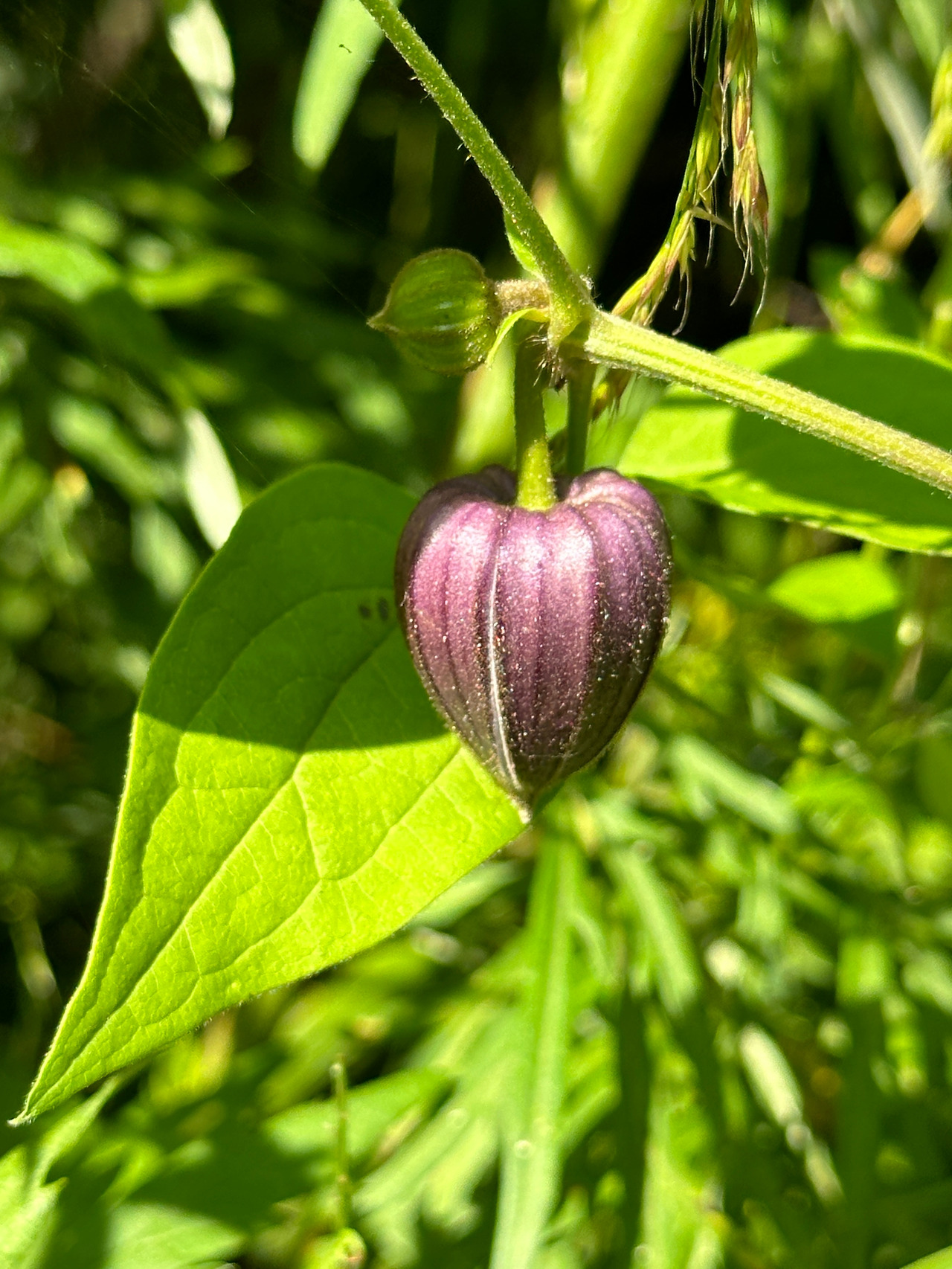 물앵도나무 주변에는 검종덩굴과 소경불알이 함께 서식하고 있었다. 이곳의 검종덩굴은 꽃이 자주색을 띠고 있어서 처음엔 일반 종덩굴로 생각했다가 나중에 팀원들의 여러 의견들을 종합해 검종덩굴로 최종 동정을 하게 되었다. 전에는 무궁화종덩굴로 불리었다가 현재는 검종덩굴로 통합된 식물이라고 했다. 종 모양의 꽃 표면에 흰털이 분포한다는 것이 판단의 근거였다. 소경불알은 꽃 모양만으로는 왕지에서 본 만삼과 똑같아 보였다. 구분 포인트는 꽃의 안쪽이 갈색이라는 점이었다. 소경불알이라는 이름은 뿌리의 모양에 근거한 것이라고 하므로 뿌리를 캐 보지 않고서는 그 이름을 쉽게 이해하기가 힘들었다. 손바닥난초와 같은 경우라고 하겠다. 꽃의 내부 모습을 아래쪽에서 위로 찍어 보니 영락없이 천정에 공이 달린 종 모양을 하고 있었다. 갈색종덩굴 등으로 명명했으면 이해하기가 참 쉬웠겠다는 생각은 하지만, 우리 선조들의 작명법에 이의를 제기할 생각은 전혀 없다. 오히려 그들의 해학에 놀라워할 따름이다.