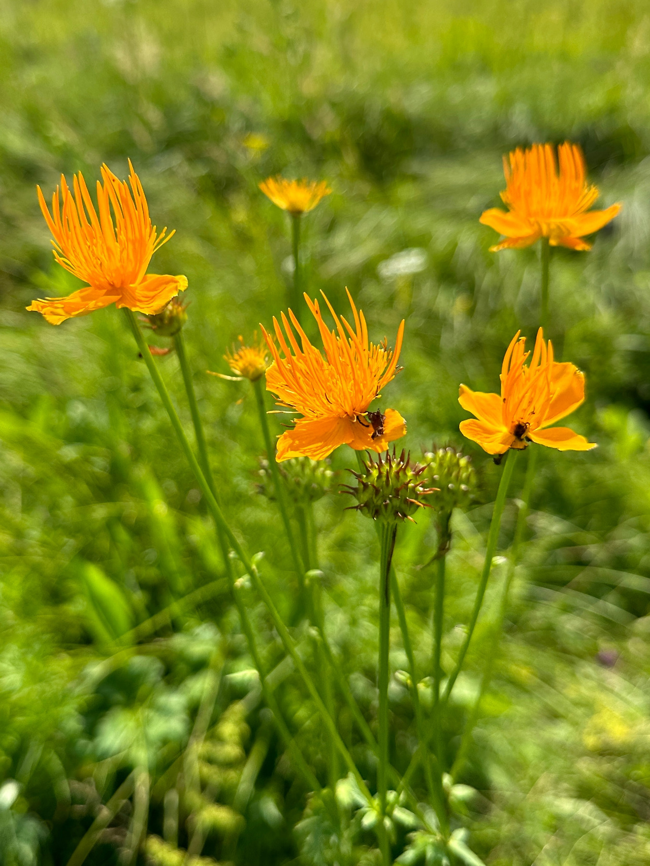 좁쌀풀을 보고 물양지꽃을 보고 물레나물을 보았다. 공통점은 모두 여리고 부드러운 노란색 계열의 꽃을 피우고 있다는 것이었다. 그런데... 이 순간에 "짜잔!"하고 외치며 다가오는 듯한 꽃들의 무리가 눈길을 확 잡아끌었다. 진한 노랑의 큰 꽃을 달고 있는 큰금매화였다! 소천지 숲길에서 그리고 서파에서 보았던 금매화가 샛노랑이라면 큰금매화는 주황색에 가까운 진노랑색 꽃을 달고 있었다. 게다가, 꽃잎보다도 많은 영역을 차지하는 꽃술은 매우 길고 모두 하늘을 향해 수직으로 곧추서 있었으며 꽃잎과 똑같은 색을 띠고 있었다. 꽃의 모든 부분이 군대 용어로 "단일대오"를 형성하고 있는 모습이다. 꽃이 지고 나서 형성된 씨방의 모습도 참 특별했다. 마치 만화에 나오는 도깨비방망이 같았다. 야구공에 뿔(가시)이 돋친 모습이었는데, 손으로 만져 보니 부드럽기 그지없었다, 도깨비 뿔 모양의 가시까지도. 큰금매화는 이쪽 습지에 엄청나게 많은 개체가 서식하고 있었다. 도로 건너편 습지에서 큰송이풀을 사진에 담는데 많은 시간과 에너지를 소비한 것처럼 여기서는 큰금매화에 매료되어 사진에 담고 또 담았다. 사진을 정리하면서 또 선택장애를 겪어야했다.