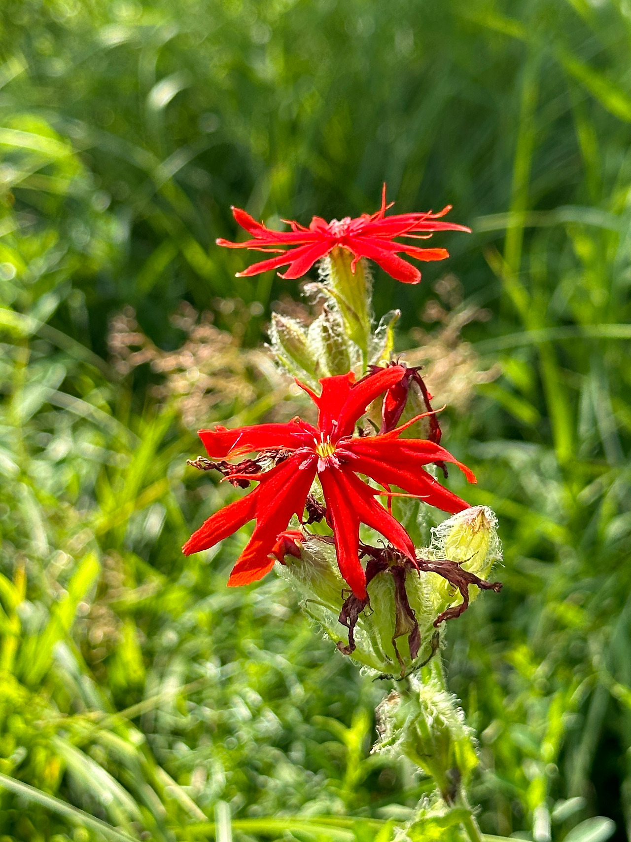 두 번째 습지의 끝부분에는 여러 가지 진귀한 야생화들이 우리의 발길을 기다리고 있는 듯했다. 먼저 우리를 반긴 것은 짙은 붉은색의 털동자꽃이었다. 털동자꽃은 줄기와 씨방에 흰털을 빽빽이 달고 있어서 그렇게 이름이 붙여진 듯한데, 사실상 일반 동자꽃과는 모양이 상당히 달랐다. 꽃잎은 상당히 가늘고 깊게 갈라져 있어서 오히려 제비동자꽃과 모양이 유사했다. 둘을 옆에 두고 비교해 보지 않으면 꽃 모양만으로는 구분이 힘들 정도였다. 제비동자꽃과 털동자꽃을 쉽게 구분할 수 있는 구별점은 털의 유무라고 할 수 있을 것이다.