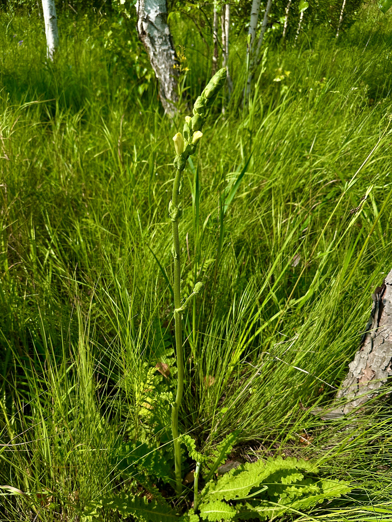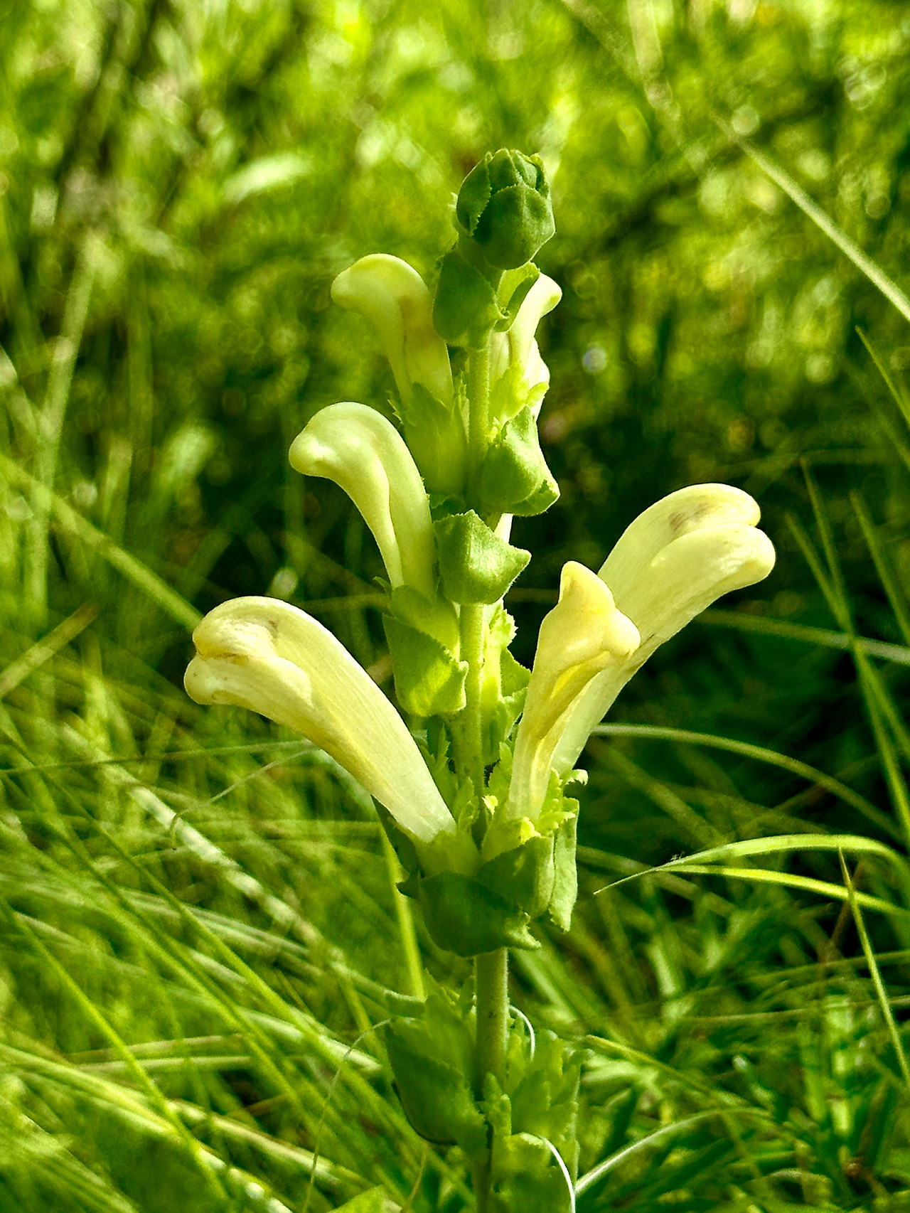 습지 안쪽 깊숙한 곳에서 마주한 액목습지의 마지막 주인공은 대송이풀이라는 꽃이었다. 이름조차 들어 보지 못한 아주 생소하고 모양도 특별한 야생화였다. 큰송이풀처럼 잎과 꽃의 모양은 일반 송이풀이랑 유사했다. 차이점은 꽃이 옅은 노랑이고 키가 송이풀처럼 크다는 것이었다. 큰송이풀과 다른 점은 꽃대가 갈라지지 않는다는 것이다. 우뚝 솟은 긴 줄기 끝 부분에 옅은 노랑색 꽃이 수직으로 피어 올라간다. 꽃차례의 모습은 서양꽃 글라디올러스 같다고 할 수 있겠다. 우리가 마주한 대송이풀은 개화단계에 막 접어든 상태로 수직 꽃차례의 아랫부분에만 개화가 이루어져 있었다. 대송이풀이라는 이름에 대해서 안내자는 큰송이풀처럼 크거나 보다 더 크다는 뜻이라고 했다. 나는 그 이름의 근거가 이해되지 않았다. 전초의 키나 크기가 큰송이풀에 비해 크지도 않을뿐더러 크다는 의미를 전달하기 위해 순한글 기본형에 한자 접두어 '대-'를 붙였다는 게 이해가 되지 않는다. 정말 크다는 의미라면 궁색하기 그지없는 명명이라는 생각이 들었다. 한글 명명자가 누군지 모르겠지만, '대-'는 길게 곧추선 줄기를 뜻하거나 긴 꽃차례의 모양이 대나무를 닮아서 그렇게 명명했다고 명명자를 대신해 변명을 하고 싶어 진다. (한글명명자가 학명 Pedicularis sceptrum-carolinum을 참고했다면, sceptrum(scepter, 왕이 권위의 상징으로 드는 홀)에 착안했을 것이라는 생각이 든다. 길게 곧추선 줄기가 분명 홀(scepter)을 닮았으므로.)