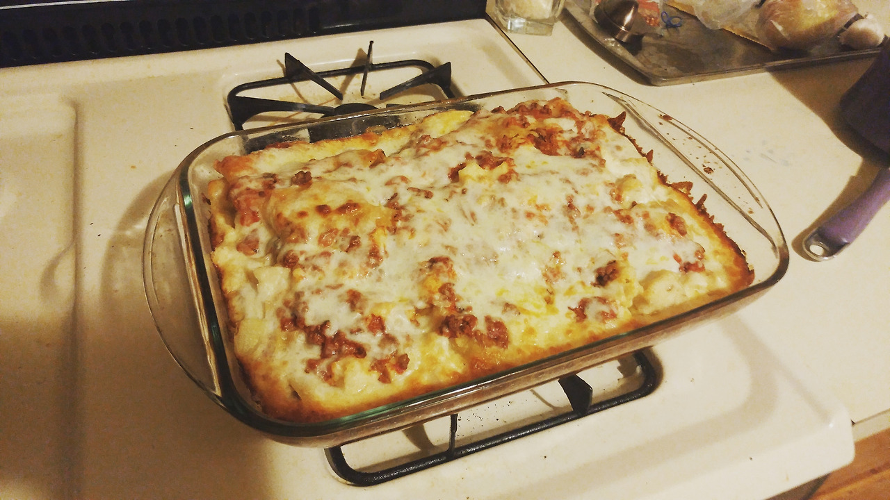 점심이 끝나고 한참 뒹굴다 여섯시쯤부터 라자냐를 준비했다. 먼저 라자냐 면을 삶고 오븐용기를 준비한다. 용기는 올리브유로 코팅해 라자냐가 들러붙는걸 방지하고, 삶아진 라자냐를 올린 후, 볼로네제부터 바른다. 그 위에 슬라이스햄, 양파, 모짜렐라, 체다 등을 넣고, 다시 라자냐 깔고 그 위에 베샤멜을 바르고 치즈로 덮고, 다시 라자냐 깔고 볼로네제 바르고. . . 이런 과정들의 반복 후엔 모짜렐라를 꽉 차게 덮어준 후 호일 덮은채로 섭씨 190도로 예열된 오븐에서 25분, 호일 열고 25분, 그리고 20분을 식히니 라자냐가 완성되었다.