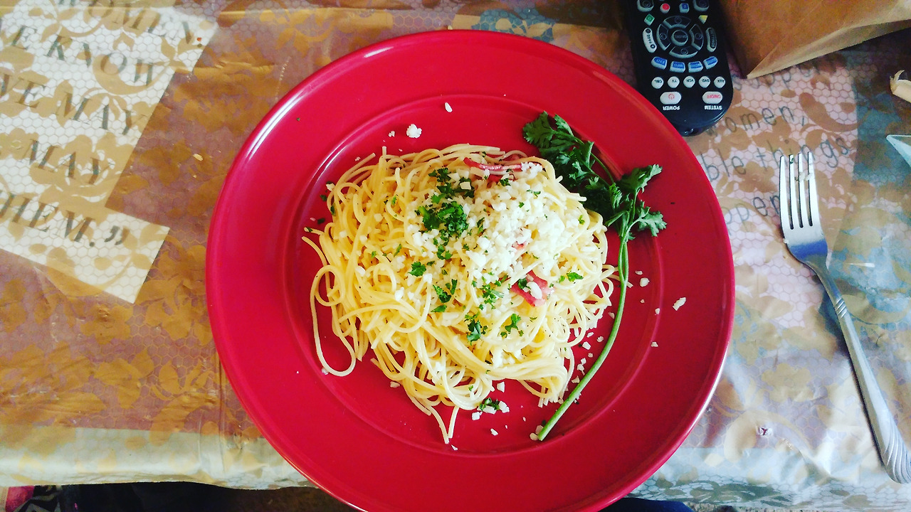 베이컨을 볶은 기름에 편으로 썬 마늘을 올리브기름과 함께 타지 않을 정도로 볶는다. 면이 익으면 팬으로 옮겨 같이 짧게 볶고, 파마산 치즈와 파슬리를 올려 마무리한다. 매운 걸 좋아한다면 청양고추나 페퍼론치노 등을 이용해도 좋다.