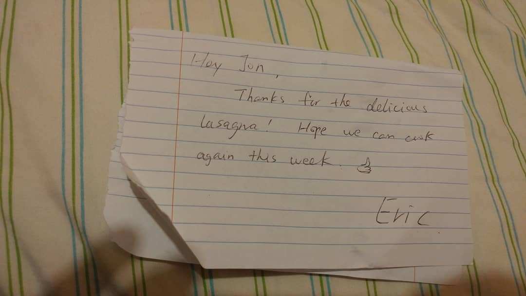 <헤이 존. 맛있는 라자냐 고마워. 이번 주에도 요리했으면 좋겠다. 에릭>