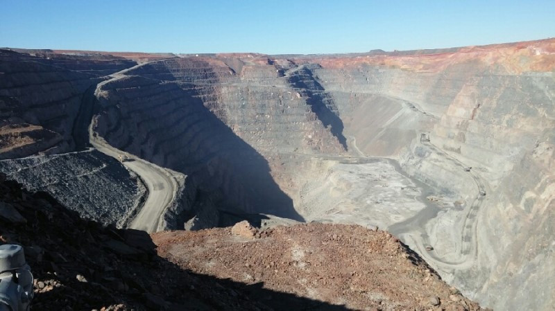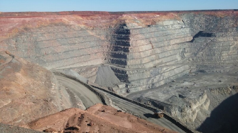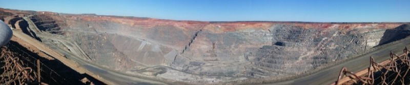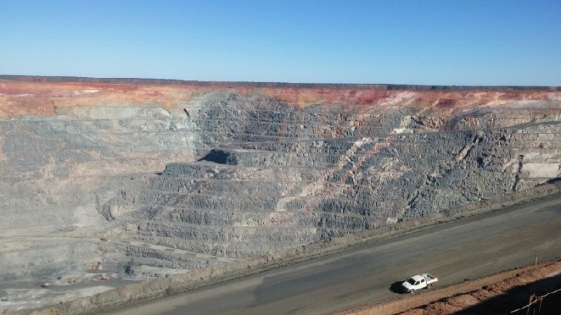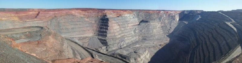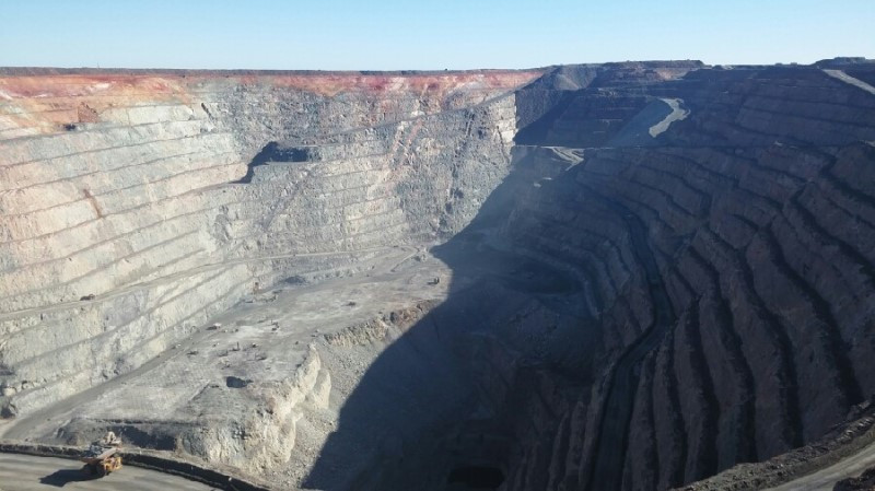 위에서 내려다 본 광산. 길이 3.5km, 직경 1.5km, 깊이 570m. 작업중인 덤프트럭들이 개미들처럼 보일 정도로 거대하다.
