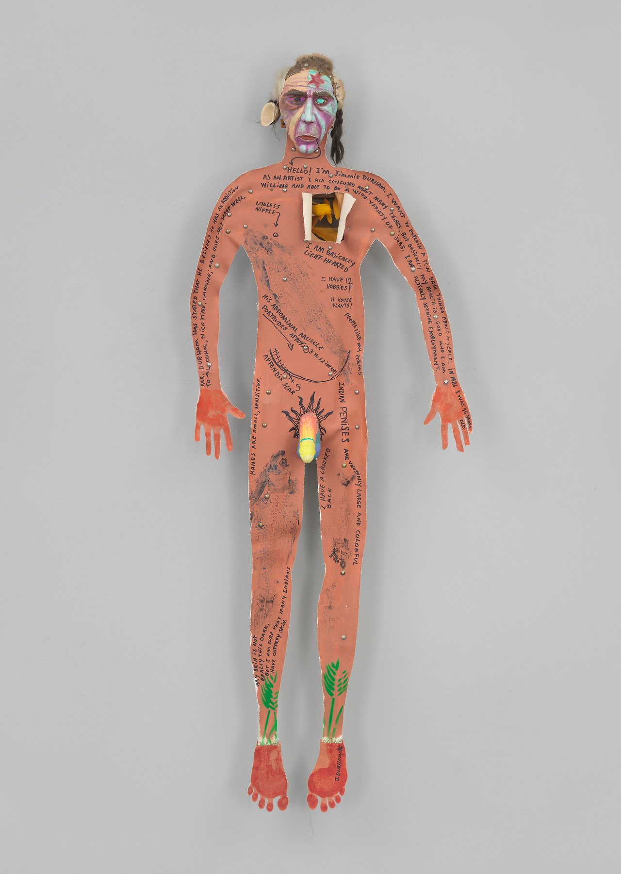 나는 그의 대표작이라고 알려진, 벌거벗은 조각상을 유심히 보았다. 대부분의 미술가들이 텍스트를 지양하는데 비해 이 작가는 하고 싶은 말이 워낙 많은지 작품 온 곳에 낙서를 갈겨놓았다. 인디언으로 보이는 그 나무 조각상엔 무지갯빛의 거대한 남성기가 달려있었고, 그는 이것을 "인디언의 페니스"라고 낙서로 알리고 있었다. 다른 부위도 마찬가지였다. "인디언의 젖꼭지"라던지. 나는 이 작가가 왜 욕먹는지 알 것만 같았다. 그들의 입장을 대변한다면서 인디언 협회 회장까지 지냈던 이 외부인이 만든 조각상엔, 미술을 잘 모르는 일반 개인인 내가 보기엔, 인디언이 겪었던 아픔이나 고독보단 어마어마한 냉소와 조롱이 느껴졌다.
