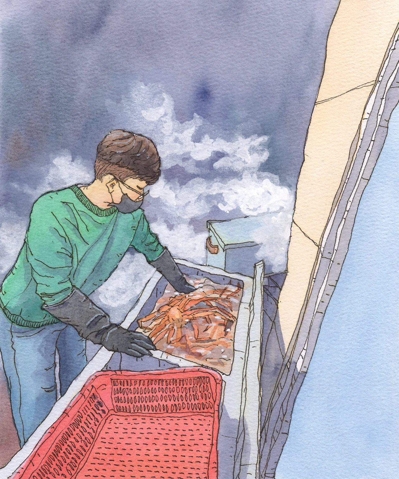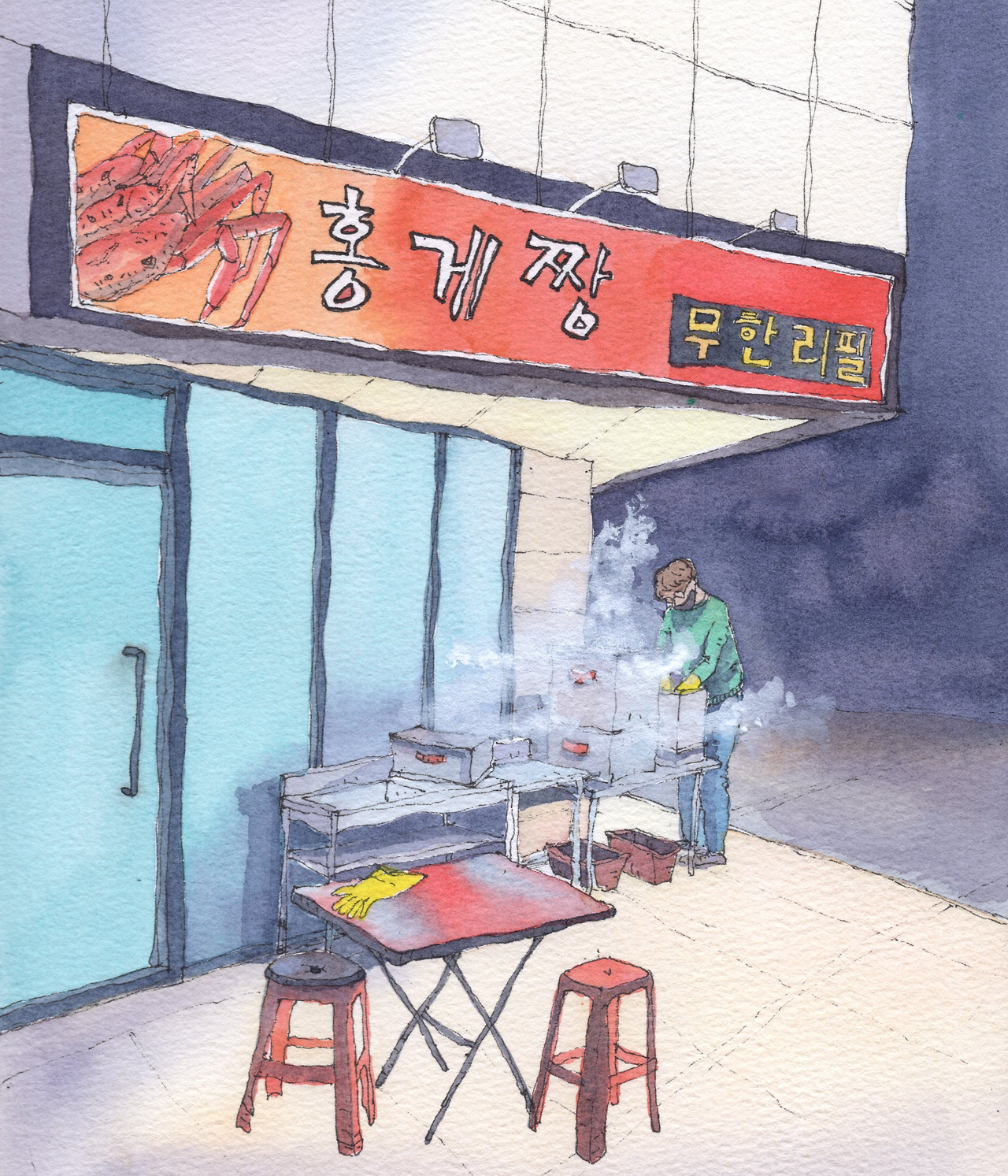 어느새 사장님은 따끈따끈한 막 찐 홍게를 큰 쟁반에 가득 얹어서 우리 테이블로 가져다주셨다. 김이 모락모락 나는 홍게들을 쳐다보며 딱 보기에도 커 보이는 녀석들을 집어들려고 하는데, 사장님은 작은 아이들이 살이 꽉 차고 맛이 좋다고 하셨다. 그러고 보니 그의 말씀대로 작은 홍게의 배 부분이 살이 꽉 들어차 있는 듯 보였다. 먹성 좋은 친구들과 몇 쟁반이나 신나게 먹었다. 사장님은 우리 식사가 끝날 때까지도 가게안에 계시지는 않고 밖에서 홍게를 세척하고 찌고, 포장하기를 계속하고 계셨다. 나는 슬쩍 그에게로 갔다.