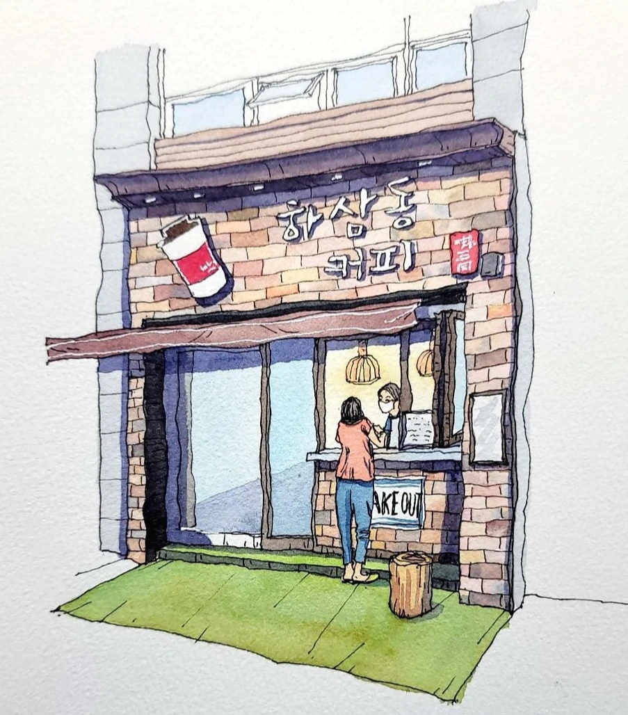 “아. 저는 주말에는 여기저기 다니면서 어반스케치를 즐기고 있고요, 평일에는 평소 그려보고 싶은 것이나 사진 찍어 놓은 것을 보고 그려요. 그림에 관심 있으시면 어반스케치 모임이 있는데 함께 하실래요?”
