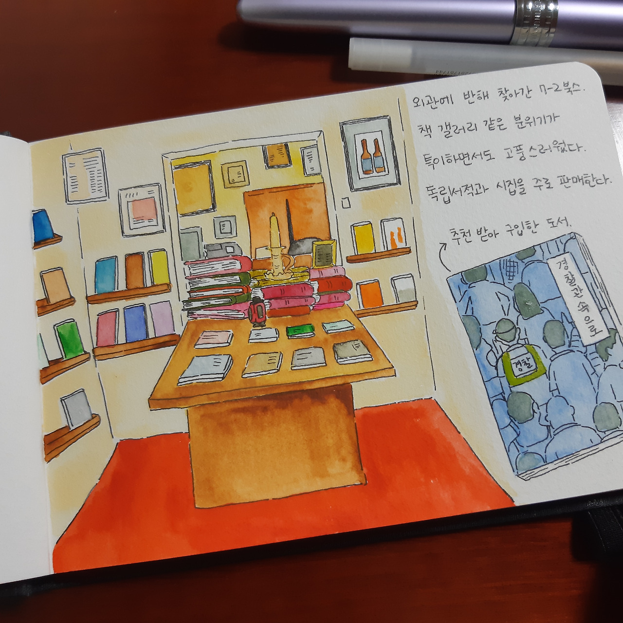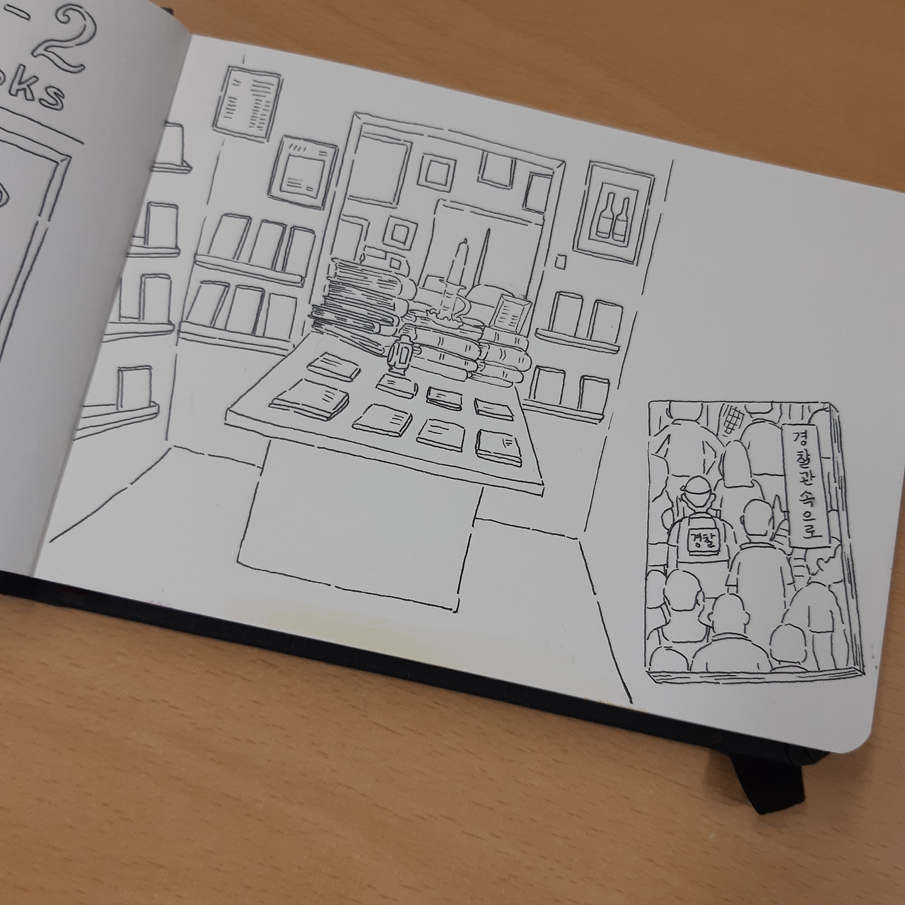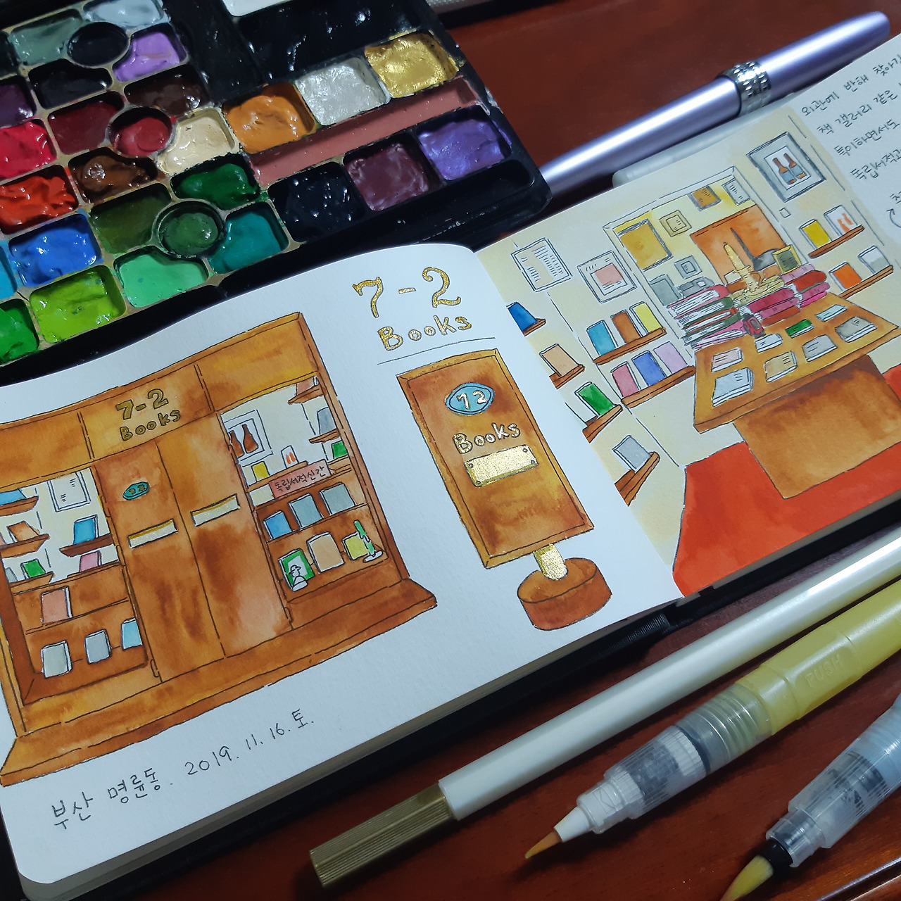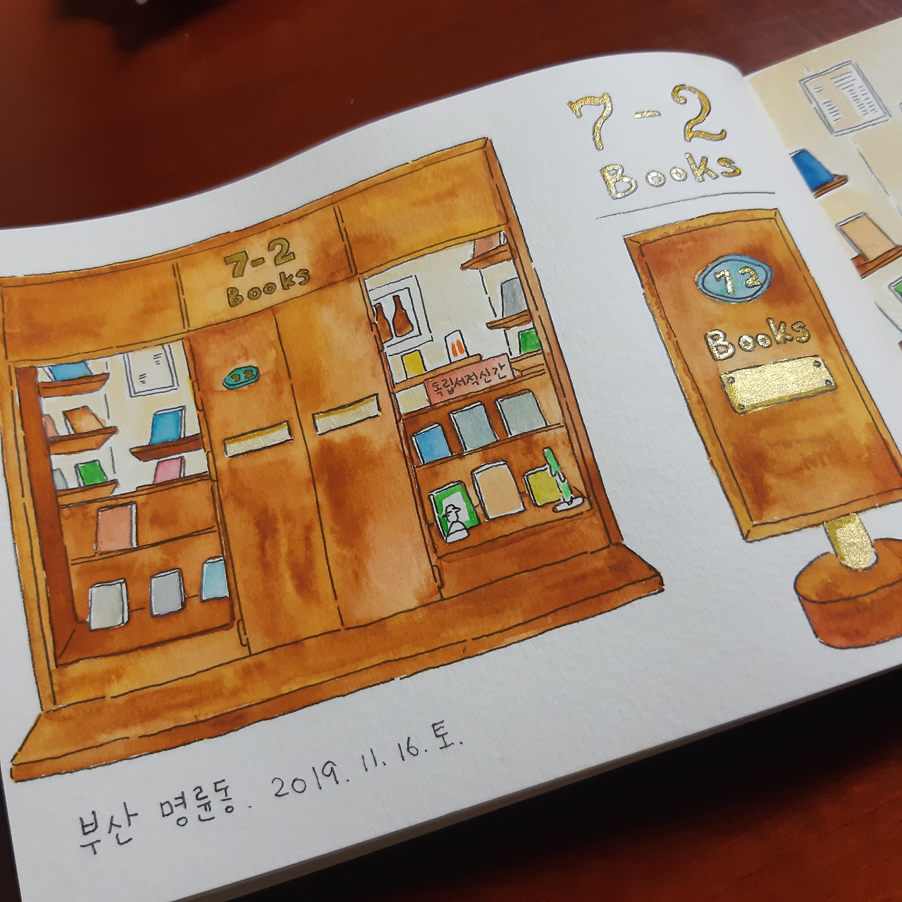 가게가 예뻐서 기분 좋게 그리기는 했지만, 막상 그리다 보니 책이 많이 보여서 좀 힘들기도..