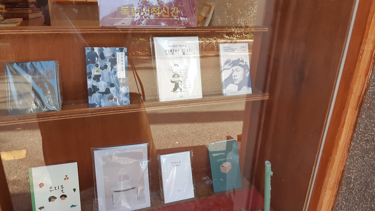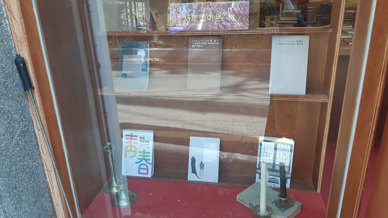 책방 외관만 보아도, 책방에 새로 들어온 책이 무엇인지, 신간으로 출간된 책은 어떤 책이 있는지 알 수 있도록 책들이 비치되어 있다.