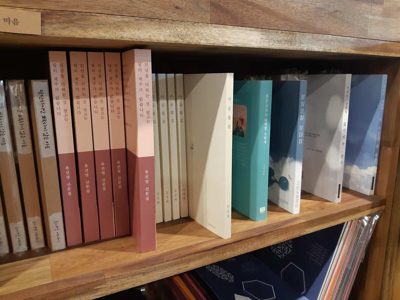 책방 곳곳에는 책에 대한 사장님의 감성과 애정을 많이 느낄 수 있었는데, 책장에서 책이 눈에 잘 들어오도록 이런 방식으로 비치해둔 방식이 독특하고 좋았다. 언젠가 나도 책방을 운영하게 된다면 이런 방식으로 비치해보고 싶은 마음이 들 정도로.