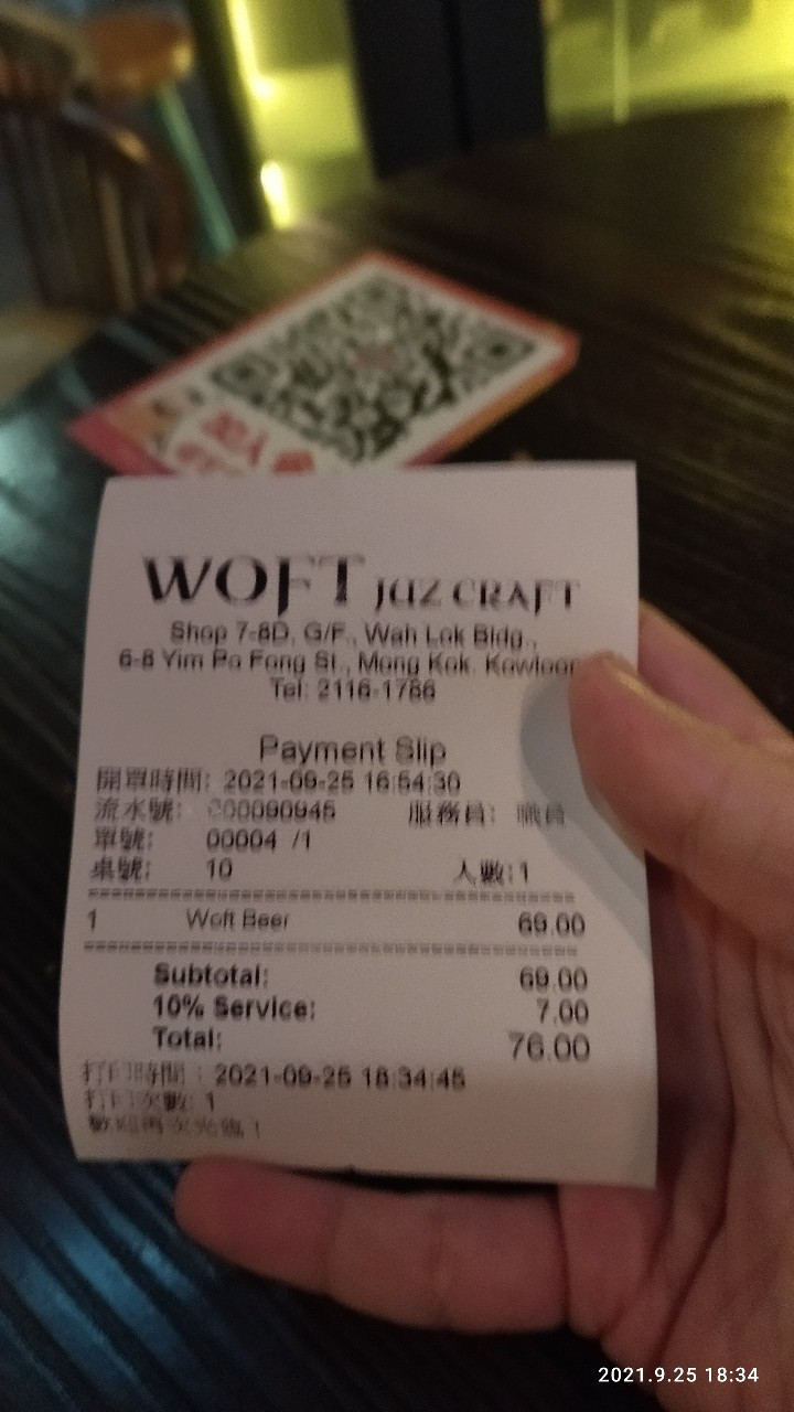 악, 내 눈! 사진이 많이 흔들렸습니다. 보시다시피 HKD 69에 10% 서비스 차지가 붙어서 총 HKD 76입니다. 1 홍콩달러는 150원이라고 보시면 됩니다. 350ml 1병 마시는 데에 1만원이 넘게 들었지요? 나쁘다는 뜻이 아니라, 홍콩의 물가를 알려드리기 위해 영수증을 첨부했습니다. 저는 이 펍의 분위기가 너무도 맘에 들어, 재방문 의사가 있습니다.