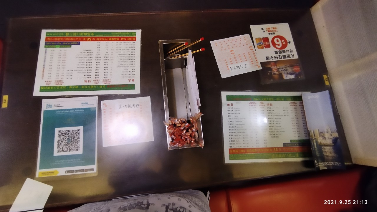 자, 드디어 테이블에 앉았습니다. 연필과 젓가락, 그리고 가운데에는 주문용지가 꽂혀 있습니다. 거기다가 자신이 먹고 싶은 대로 체크해서 주면 됩니다. 저는 국물의 매운 맛과 신 맛 조절 칸에만 체크하고 추가로 토핑을 넣지는 않았습니다. 저녁 9시가 넘어 식사하면서 배 터지게 먹을 일은 없습니다. 그리고 기본적으로 양이 엄청나게 많습니다. HKD 30인 기본 국수에는 이미 채소와 고기가 들어 있습니다. 다만 물이 따로 제공되지 않기 때문에, 코카콜라를 추가 주문했습니다. 여기는 코카콜라가 물보다 더 쌉니다.
