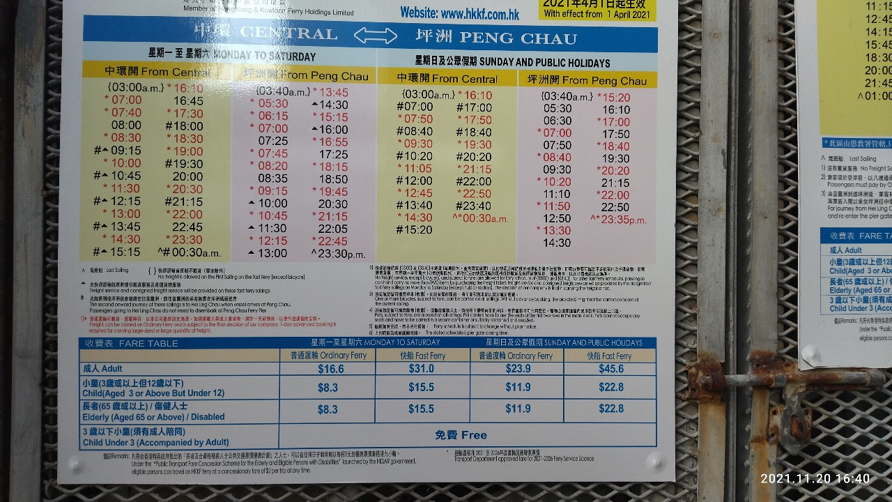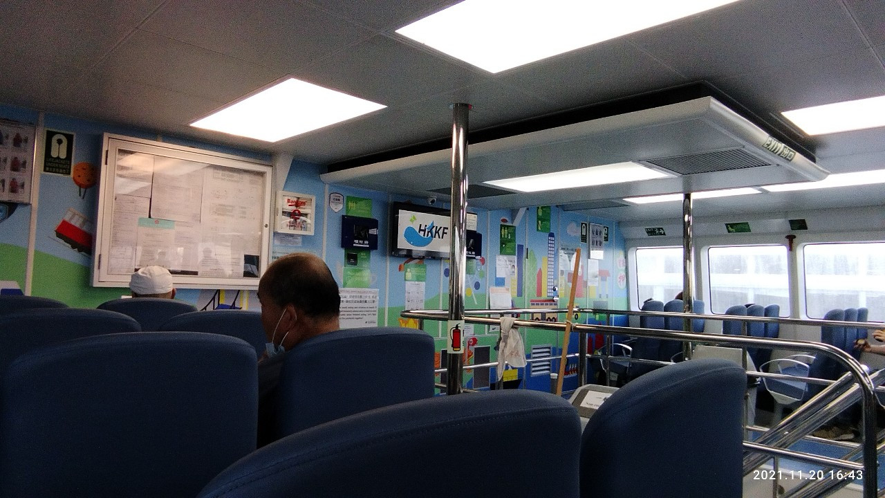 자, 시간표를 보니 16시 45분 페리를 타면 딱 좋을 듯합니다. 그래서 무심코 옥토퍼스 카드를 찍고 들어갔더니...이게 무슨 일입니까! 저는 ordinary ferry (16.6 홍콩달러)를 이용하고자 했는데, 타고 보니 fast ferry(31.0 홍콩달러)였습니다. 여기에서 눈물을 머금고 꿀팁을 제공합니다. 상기한 표에서 빨간색 글자로 표기된 시간대가 ordinary이고, 검은 색 글자가 fast입니다. 따라서 페리를 타실 때에는 항상 글자 색깔을 잘 살펴보시기 바랍니다. 따지고 보면 어차피 1시간을 기다렸다가 ordinary를 탈 생각은 없었습니다. 이것도 경험이지요.