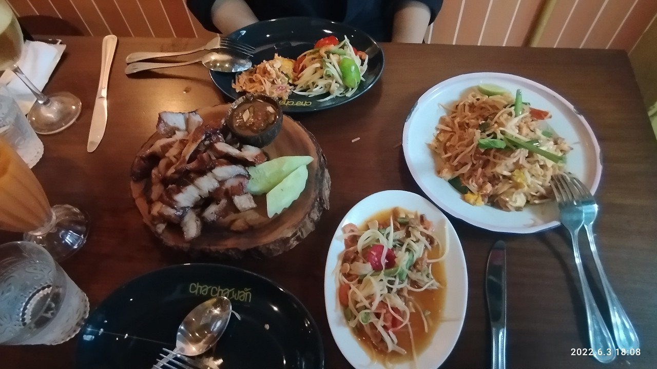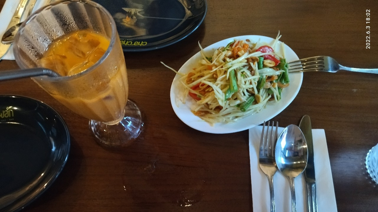 어제와 마찬가지로 저는 타이 밀크 티를 주문하였으며, 아울러 "쏨땀"을 주문했습니다. 그 외 닭고기 볶음밥과 돼지고기를 추가했습니다. 쏨땀이야말로 맥주 안주지요. 아, 독자 여러분께서는 카오산 로드에서 쏨땀을 주문한 뒤 싱하 맥주를 무한정 퍼부었던 추억이 있으신가요? 특히 송끄란 물축제 때 마시는 싱하 맥주가 최고였습니다.
