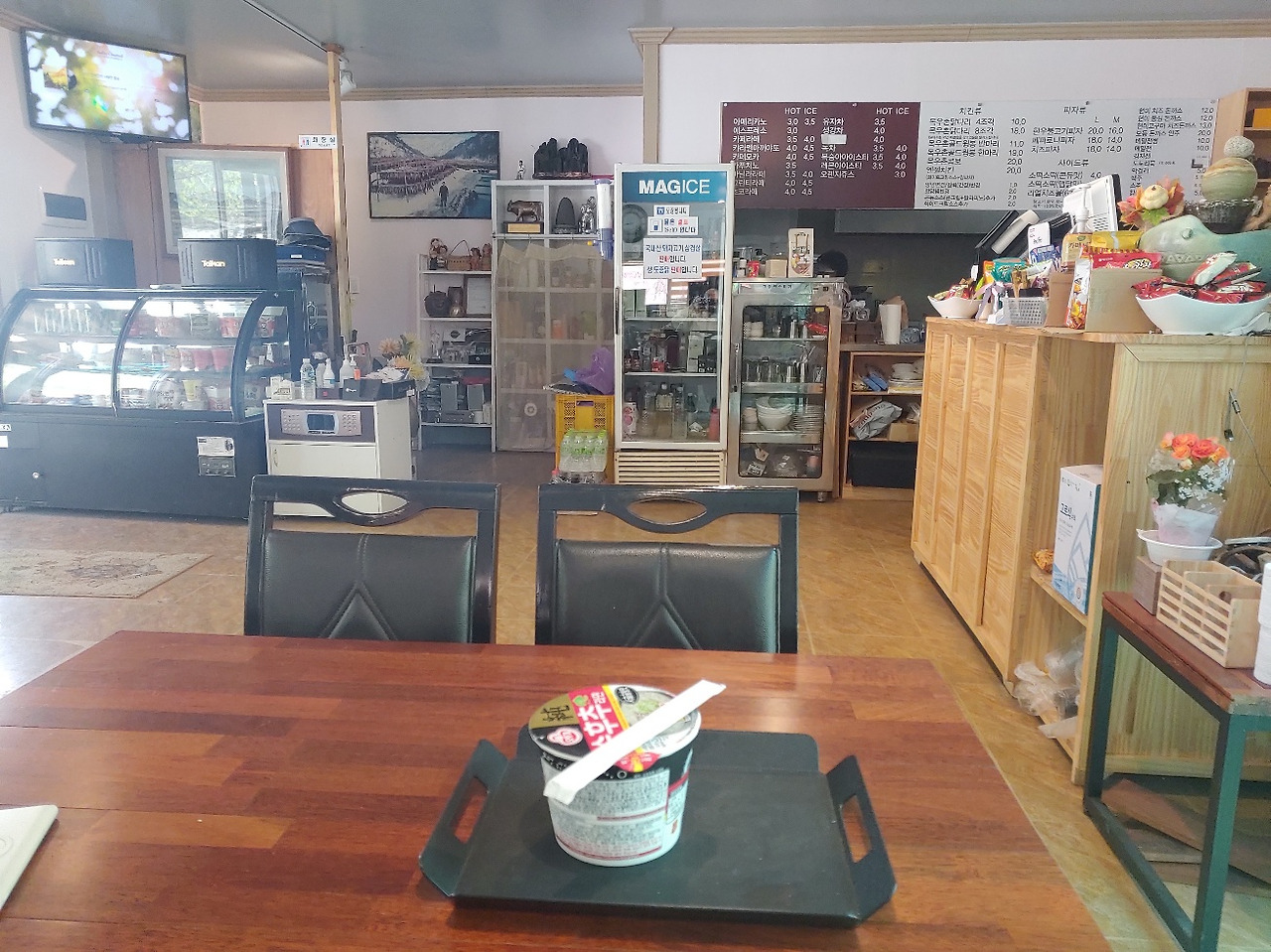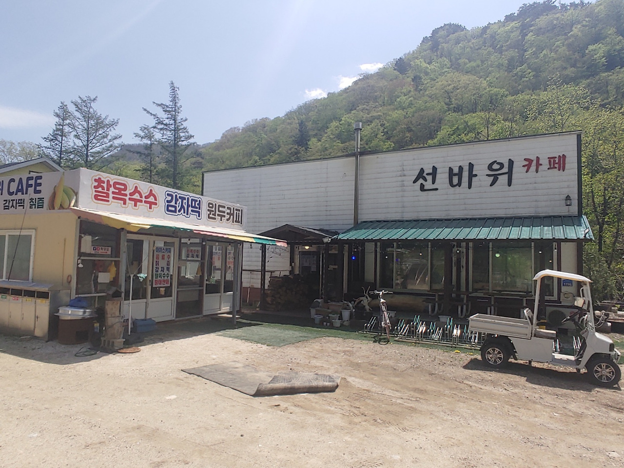 이 때 저를 구해준 것이 바로 이 <선바위카페>입니다. 처음에는 '감자떡'을 먹으러 무작정 뛰어들었는데, 사람이 없었습니다. 그래서 카페에 빵이라도 좀 팔겠거니 하고 들어갔더니, 즉석라면이 여럿 있었습니다. 과자도 있었고요. 친절하신 아주머니께서 즉석라면을 손수 마련해서 주셨습니다. 그 동안 저는 지쳐서 테이블에 엎드려 있었습니다.