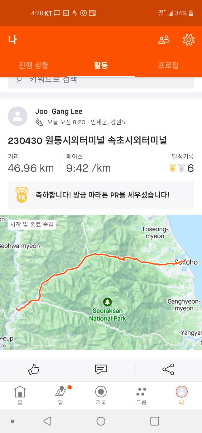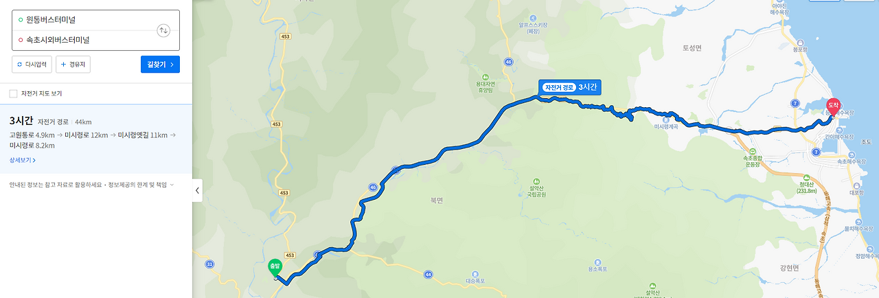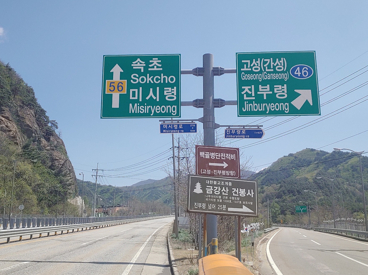 그리고 제가 잡은 4월 30일 여행 코스는 원통시외버스터미널에서부터 속초시외버스터미널까지 이르는 44km 구간의 여행입니다. 마라톤 코스(42.195km)보다 조금 더 긴 수준이지요. 하지만 도로가 통제되고 잘 짜여진 마라톤 코스와는 달리, 도보여행을 위해 세심하게 마련된 코스가 아닌 이와 같은 코스를 갈 때에는 지나치게 무리해서는 안 됩니다. 저도 이번 여행에서 지도가 알려준 대로 갔다가 길이 막혀 몇 번을 돌아나와야 했는지 모릅니다. 게다가 원통에서 속초로 가려면 미시령을 넘어가야만 하죠. 길이 잘 닦였기 때문에 어렵지는 않습니다만, 그래도 난이도가 있습니다. 게다가 저는 당일치기 여행을 생각했기 때문에, 어떻게든 귀경하는 막차가 끊기기 전에 속초 터미널에 도착해야만 했죠. 저는 8시 30분에 원통시외버스터미널에서 도보로 출발하여 16시 20분에 속초시외버스터미널에 도착했는데, 거리나 시간 상으로 매우 괜찮았던 코스라고 생각합니다.