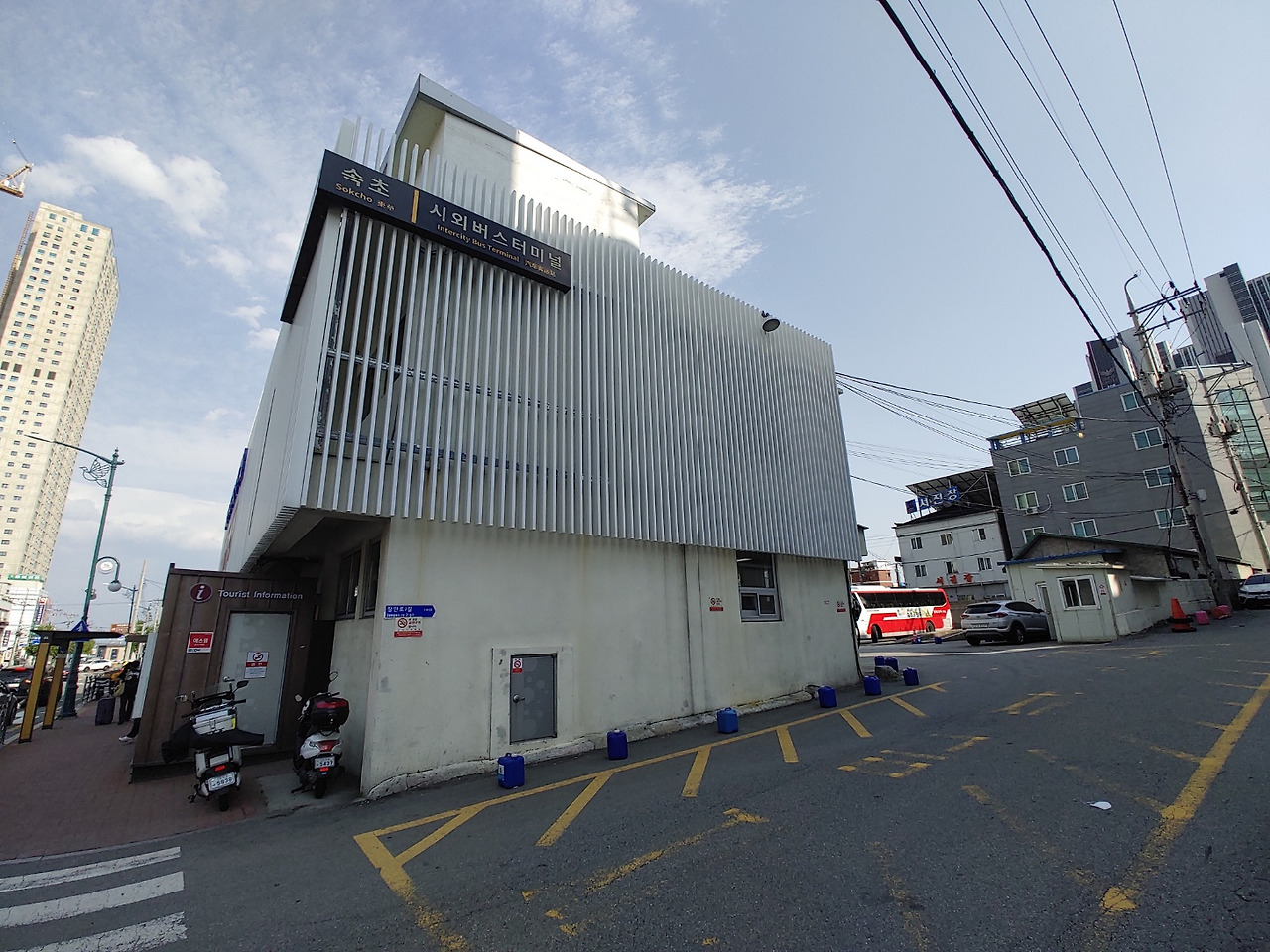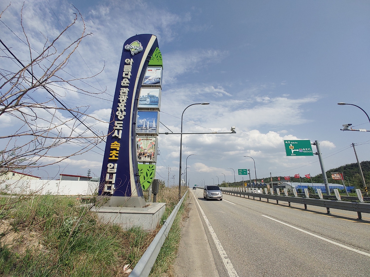 자, 아름다운 휴양도시 속초에 도착했습니다. 사진상으로는 갓길이 상당히 위험해 보이지만, 실제로는 너비가 꽤 됩니다. 속초에 들어왔다 뿐이지, 아직 갈 길이 멉니다. 하지만 이제는 도시에 진입했다는 안도감에서인지 다리에 더욱 힘이 붙습니다. 시외버스터미널은 56번 국도에서 살짝 벗어난 곳에 있기 때문에, 결국에는 주변 속초인들에게 물어서 갈 수밖에 없었습니다. 시청 주변을 헤매다 다시 왔던 길로 되돌아가야 한다는 말씀에, 일단 편의점에 들어가서 샌드위치 2개를 사서 씹으면서 걸어갔습니다. 제가 가는 방향으로 고속버스들이 끊임없이 보이는 것을 보니, 이제 거의 다 왔나 봅니다.