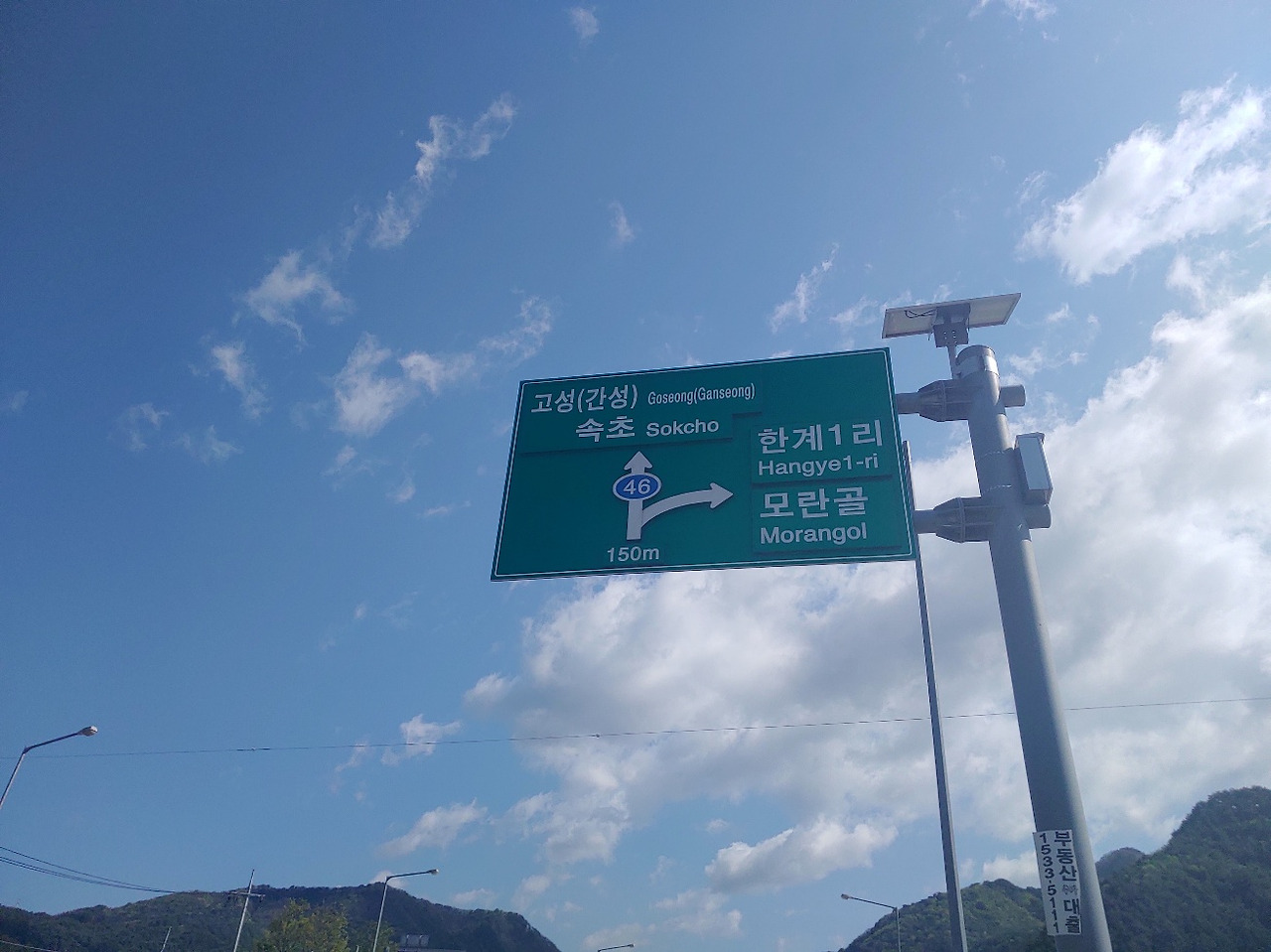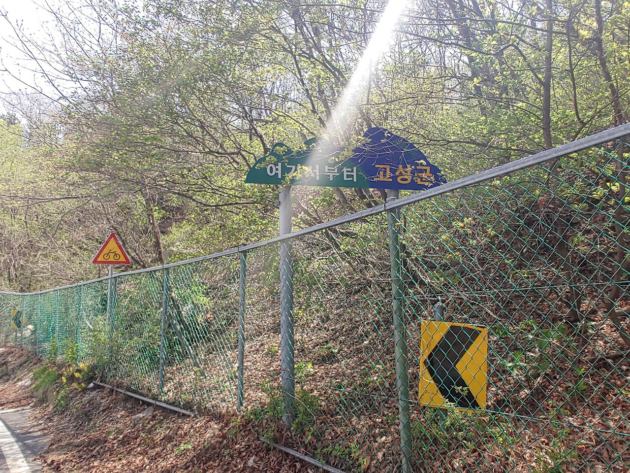신나게 걸어내려오다가 "여기서부터 고성군"이라는 글씨를 보자마자, "아뿔싸, 사진을 안 찍었네!"하고 외쳤습니다. 하지만 다시 걸어 올라갈 생각은 없었고, 수 km에 이르는 길을 걸어내려갑니다. 이제는 오직 내리막밖에 없습니다. 속초시외버스터미널에 도착할 때까지 그렇습니다. 바람에 흔들리며 신나게 걸어내려갑니다.