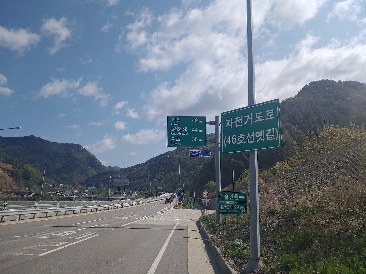 위의 지도를 보시면 아시겠지만, 저는 자전거를 통해 이동하는 코스를 그대로 밟아나가고 있습니다. 이 때문에, 국도 갓길을 주로 해서 이동하고 있습니다. 국도 갓길을 걷는 데에 두려움을 느끼시는 분들은 아마 이와 같은 여행을 자제하시는 편이 좋습니다. 제 경우에는 옆에 덤프 트럭이 지나가도 전혀 쫄지 않는 성격이라 가능했지만 말이죠. 원통에서 속초까지 가는 국도는 갓길이 매무 넓게 형성되어 있어서, 맨 끝으로 붙어서 걸어다닐 경우 그렇게 위험하지 않습니다. 물론 이불 밖은 항상 위험합니다. 부언하자면, 자전거를 통해서 국도로 이동하는 경우가 훨씬 위험합니다. 용문-속초 라이딩하는 라이더들은 항상 자동차 운전자들에게 감사하셔야 합니다. 이들은 심지어 자전거전용도로조차도 이용하지 않습니다. 왜냐하면 싸이클용 자전거인 로드바이크는 바퀴가 얇아서, 자전거 전용도로로 달리더라도 펑크의 위험이 높기 때문입니다. 이 때문에 대부분의 라이더들은 자동차 도로에서 떼를 지어 달립니다. 문제는 이렇게 달릴 경우, 자전거를 탄 이뿐만 아니라 자동차 운전자들에게도 위험하다는 점입니다. 도보여행자야 갓길에 딱 붙어서 이동하니, 자동차 운전자에게도 위협이 될 상황은 거의 발생하지 않겠지요.