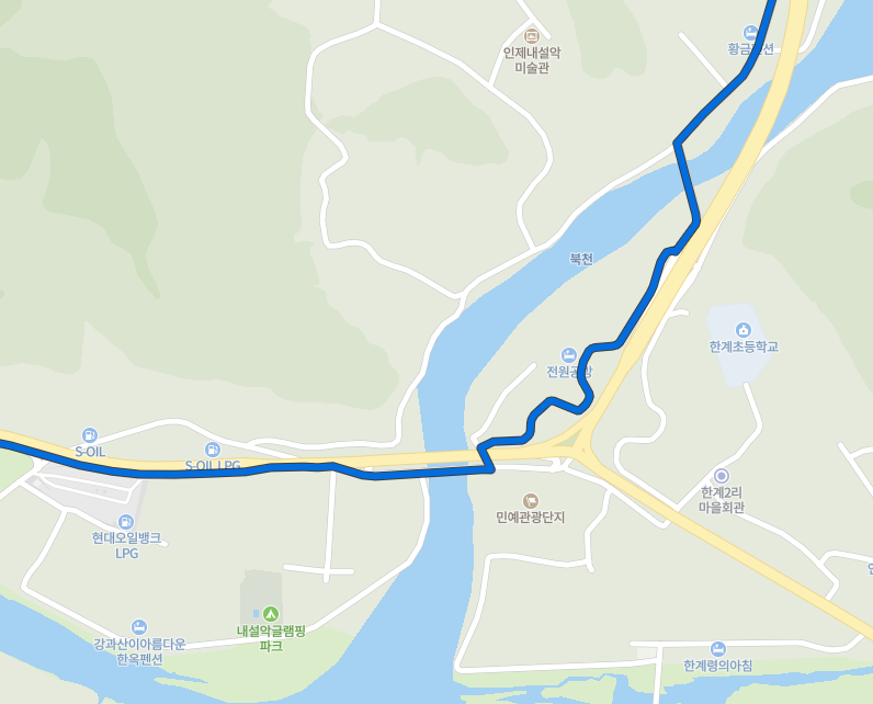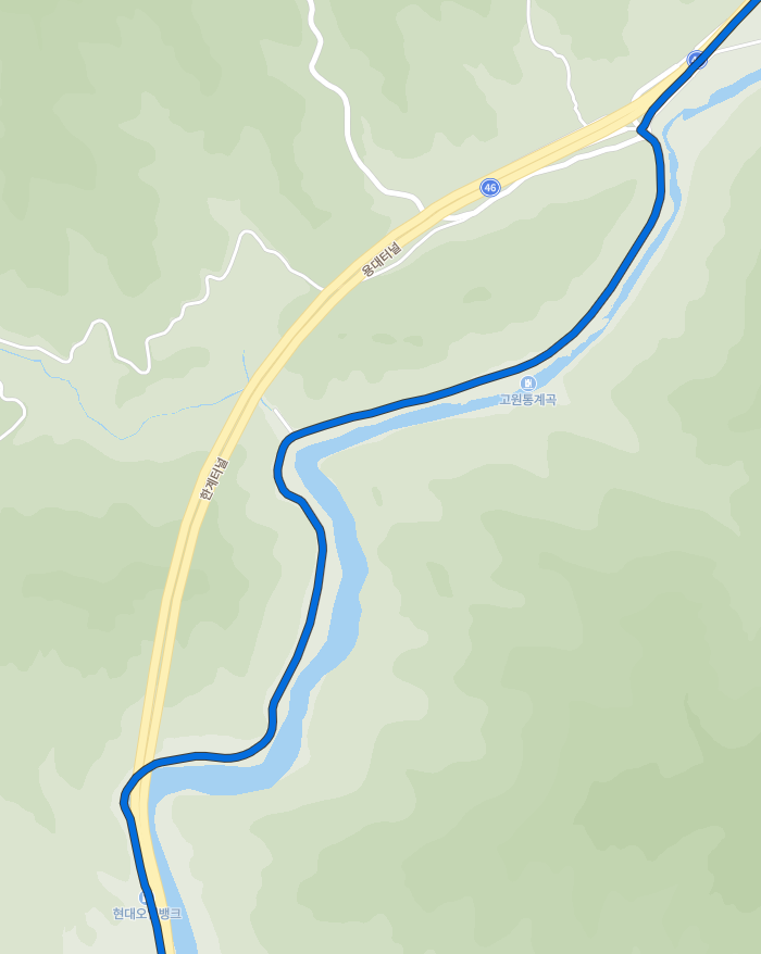 네이버 지도를 보면, 한계터널과 용대터널을 우회해서 가라고 나와 있습니다. 저도 여행을 준비하기 전에 이 점을 충분히 인지하고 있었습니다. 왜냐하면 터널 안을 걸어서 갈 경우 나쁜 공기를 잔뜩 마시고 자동차의 굉음까지 계속 들어야만 하기 때문입니다. 반면에 저렇게 둘러 가면 시간은 다소 더 걸리겠지만, 많은 라이더들이 용문-속초 구간에서 이 46번국도옛길이 가장 아름답다고 칭송합니다. 반드시 걸어봐야죠. 그리고 저는 분명히 이 길이 나뉘는 지점을 봤습니다.