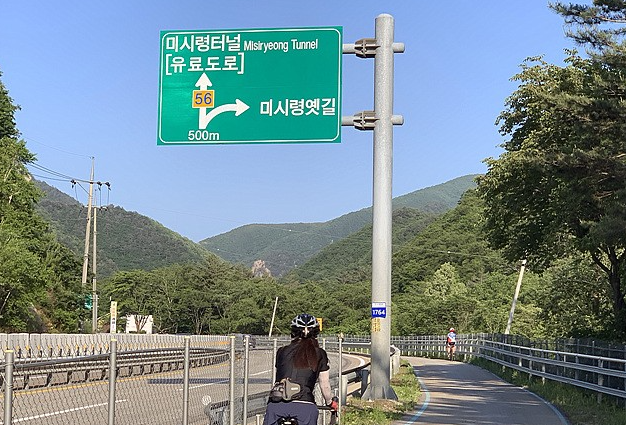 미시령터널과 미시령옛길로 갈리는 이 지점에서 반드시 미시령옛길로 들어서야만 합니다. 미시령옛길로 걷다 보면 나중에 다시 56번 국도로 합류합니다. 하지만 미시령터널로 가면 또 그 지옥같은 터널 체험을 해야만 합니다. 그래서는 안 되겠지요. 그래서 자전거길이 잘 닦여 있는 미시령옛길로 들어섭니다.