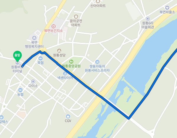 멋지게 차려 입은 젊은 커플들이 꽤나 보이는데, 제가 원통에서 하차할 때까지 상당수 남아 있었습니다. 아마 속초나 양양으로 향하는 친구들이겠지요. 본디 원통시외버스터미널에는 8시 10분에 도착해야했지만, 항상 그렇듯이 다소 지체되어 8시 반에서야 비로소 도보여행을 시작할 수 있었습니다.