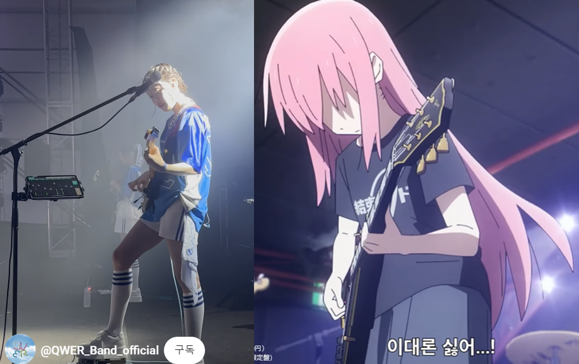 8월 2일(금) QWER 펜타포트 락 페스티벌 공연 및 <봇치더록!> 영상을 모두 챙겨본 저는 두 "작품"들이 서로 겹치면서 두 배의 즐거움을 느꼈습니다. 소감문이 단편 소설 수준으로 길어질 수 있기에, 딱 두 장면만 꼽겠습니다.