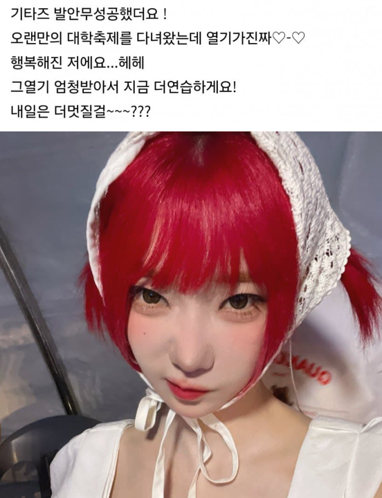 모든 공연이 끝난 뒤 포토타임을 가지기에 앞서, 마젠타는 "뒤통수가 재미있어도 탈모 아니니까, 오해하지 말아주세요!"라고 말해 마지막까지 큰 웃음을 주었습니다. 그녀들의 빨간 가발이 시간이 지남에 따라 상당히 망가져서, 뒷부분이 휑하니 비어보였기 때문입니다. 미니앨범 2집 타이틀이 <내 이름 맑음>이고 수록곡이 <메아리> <달리기> 등인데, 그 때에도 빨간 가발을 쓸 가능성은 낮습니다. 이왕 파격적인 행보를 보이고자 한다면, "탈모 가발 아이돌"을 한 2주쯤 해보는 것도 나쁘지 않겠다고 생각했습니다. 그래도 한동안 행사 후반부나 마지막을 장식하다가 오늘은 첫번째 공연팀으로 나서서 일찍 끝나니, 다소 아쉬웠습니다. 하지만 내일은 또 전주대학교 대동제에 참석해야 하니, 어서 귀가하여 쉬는 편이 낫겠습니다.