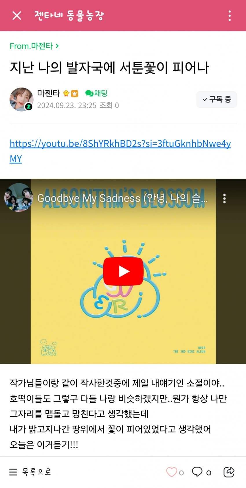 신규 앨범 수록곡 전부를 듣기는 했지만, <사랑하자>와 <달리기> 그리고 쇼케이스 리뷰까지 하기에는 시간이 부족하네요. 하지만 제 느낌이 싱싱하게 살아 있을 때 리뷰를 남기는 편이 좋기에, 오늘은 <메아리>까지만 다루고자 합니다. 아, <내 이름 맑음>과 <안녕, 나의 슬픔> 쇼케이스 라이브도 시청했는데, <안녕, 나의 슬픔>은 라이브가 더 좋더군요. 결국 히나를 제외한 QWER 멤버들과 바위게들 모두 쇼케이스 현장에서 눈물을 터뜨리고 말았습니다. 본인이 불렀으면서 대성통곡한 시요밍, 도대체 어디까지 한꺼번에 올라갈 생각입니까! 이미 당신께, 저 마허라는 조복되었습니다.