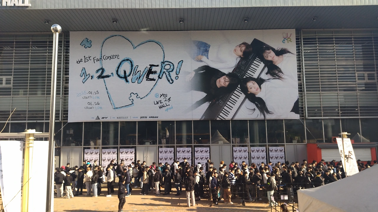 3시에 도착하자마자 거대한 QWER 사진 아래 길게 줄을 선 바위게들을 볼 수 있었습니다. 버팔로도 때려 잡을 그들의 거대한 사이즈를 확인할 수 있었죠. 맨 뒤로 가서 봐야겠다는 확신이 더욱 굳어졌습니다.