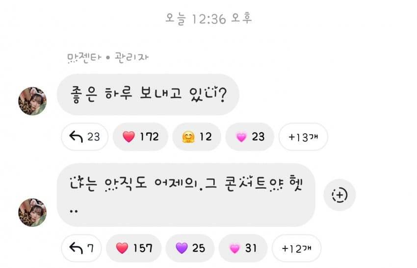젠타의 마음은 모든 바위게들의 마음과 똑같군요. 저 또한 월요일 아침까지 브런치 글들을 수정하면서, 여전히 콘서트의 여파에서 벗어나지 못했습니다. 하물며 그녀는 공연의 당사자로서 바로 전날까지 활약했으니, 오죽하겠습니까! 심지어 QWER 매니저 검검(검은수염)은 1월 28일(화) 새벽 2시가 넘은 시각 "QWER 콘서트 세트리스트 순서 그대로" 노래방 개인 콘서트를 라이브 방송함으로써, 콘서트 도파민이 가시지 않아 잠 못 이루던 바위게들을 열광시켰습니다. 그렇구나. 우리 모두 그렇게나 기다렸고, 이렇게나 좋았고, 저렇게나 못 잊는구나.