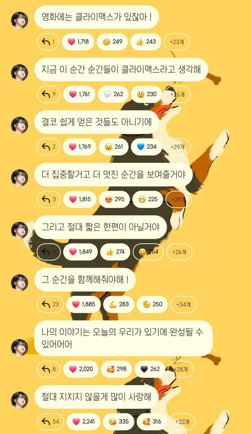마젠타의 편지는 어찌나 길었는지, 중간에 화면 올라가는 속도가 빨라지기 시작했습니다. 진심을 담은 수많은 말들 속에 "누군가에겐 오늘의 제가 작은 자극이 되었음 좋겠어요! '나도 할 수 있을까?'라는 고민을 가진 분들에게 저의 이야기가 용기가 되기를! 정말로요. 저의 첫 모습을 아시나요? 박자를 모르는 베이스, 음악을 해본 적 없는 밴드 멤버 그게 저였어요. 그랬던 제가 잘 보이고 싶단 마음과 작은 노력을 쌓다 보니, 어제보다 나아질 수 있었던 것 같아요. 그 마음 하나만으로도 충분히 달라질 수 있다는 걸 오늘 이 무대로 여러분들께 보여 드리고 싶었어요."라는 멘트가 특히 와닿았습니다.