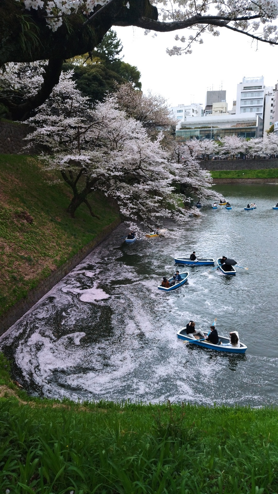 저는 벚꽃이 흐드러지게 핀 광경보다는, 핑크(쟈 나이, 마젠타다!)빛 꽃잎들이 바람에 날리는 모습 그리고 맑은 호수 위에 떨어져 띠를 이루며 소용돌이치는 장관을 더욱 좋아합니다. 키타노마루 공원 입구 쪽에서는 호수 위에 뭉쳐 떠다니는 벚꽃들을 헤치며 손가락으로 연신 건져내는 연인들의 보트를 쉽게 볼 수 있습니다. 그런데 사진 중앙에 홀로 노를 젓는 사내가 보이죠? 수컷 바위게일 확률, 50% 봅니다. 고개를 숙인 것을 보니, 온라인 커뮤니티 활동 중인지도 모르겠습니다.