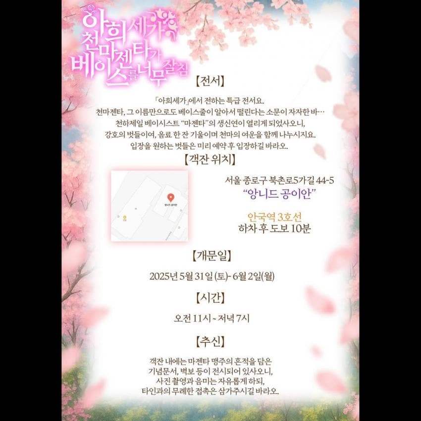 5월 31일 늦은 오후, 저는 안국역으로 향했습니다. 물론 평소에는 관광객들로 넘치는 삼청동 쪽을 가기가 꺼려집니다. 하지만 한옥을 빌려 꾸며진 마젠타 생일카페가 열리는데, 이건 못 참죠.