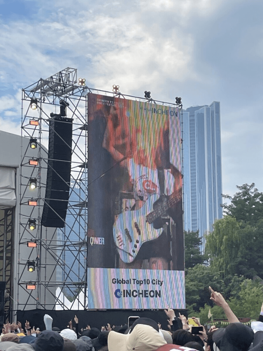 수많은 국내외 팬 콘서트와 5번의 버스킹, 그리고 각종 축제로 단련된 QWER은 작년과는 차원이 다른 밴드였습니다. 열심히 준비해 온 인트로로 한껏 분위기를 고조시킨 QWER은 <디스코드>로 힘차게 출발했습니다. 바람에 흩날리고 땀방울에 떡이 진 머리로, 메추라기 락커 시요밍은 무대를 휘저었습니다. 오늘 시요밍과 마젠타는 작정이라도 한 듯, 헤드뱅잉을 쉬지 않았는데요. 꼬꼬마들은 그렇게 손발과 머리가 바빠야 합니다. 반면에 롯데타워 기타리스트 히나는 긴 다리를 쭉 뻗어 앰프 위에 올리는 것만으로도, 더위로 인해 이미 정신이 혼미한 음악 팬들을 기절 직전까지 몰고 갔습니다.