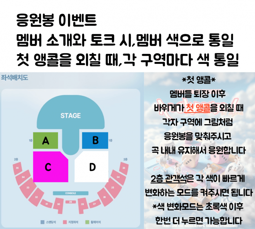 저는 C구역에 있으니, '핑크가 아닌 마젠타' 빛깔로 응원봉을 세팅해야겠군요! 물론 필요할 때마다 말이죠.