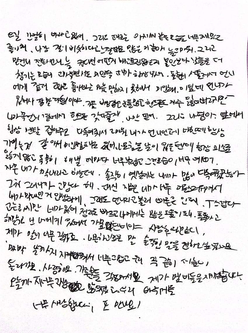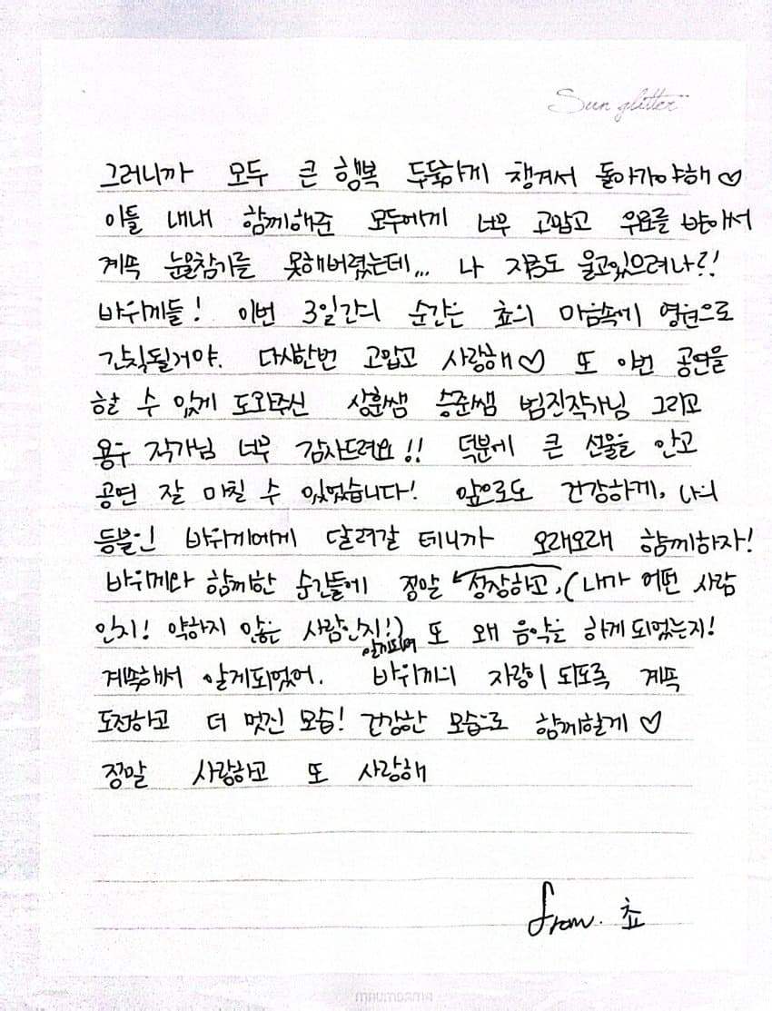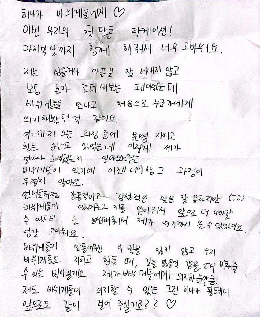한편 4명 가운데 가장 단정한 글씨를 자랑하는 쵸단은 멤버 가운데 유일하게 편한 반말체로 바위게들에게 편지를 썼습니다. 그만큼 바위게를 가장 가까운 친구, 아니 그녀의 솔로곡 제목인 '마니또'로 생각한다는 뜻이겠지요. 지혜야, 바위게들은 이미 충분히 넘치는 사랑을 네게 받고 있어. 부디 아프지 말고, 오래오래 함께 하자!